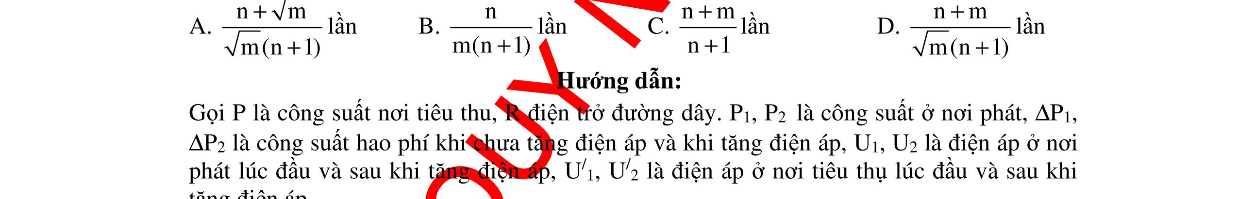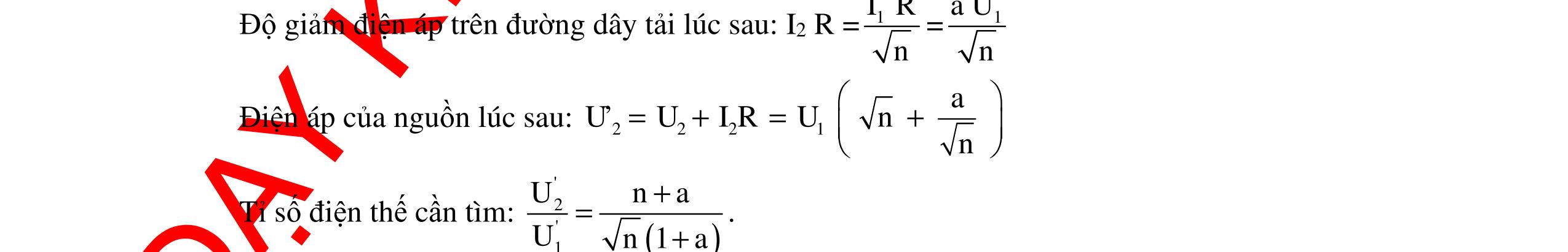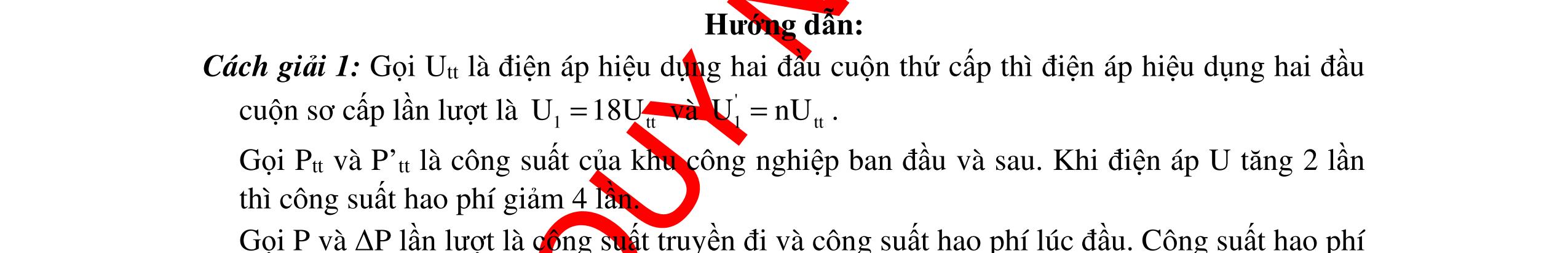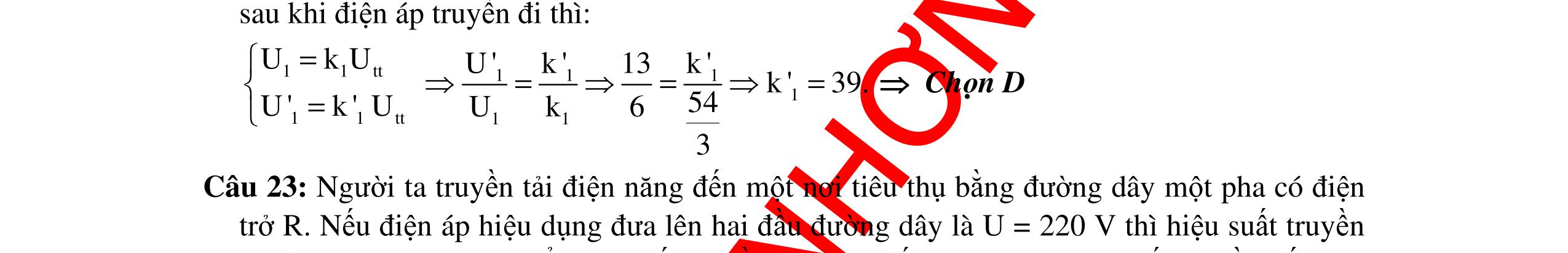 DẠYKÈMQUYNHƠNOFFICIAL 451 Câu 5: Chọn A. Từ công thức: =ϕ=ϕ 2 22U PcosPcos R coäng höôûng π == 2 P200cos100W. 4 Câu 6: Chọn B. Áp dụng công thức: =ϕ 2 2U Pcos R ϕϕ = =≈=+ ϕϕ 2 2222 1111 PcoscosP 1,2247100%22,47% PcoscosP . Câu 7: Chọn C. Cách giải 1: Theo đề dễ thấy cuộn dây không cảm thuẩn có r. Với 22 dL ZrZ =+ . Trên giản đồ do cộng hưởng: LC ZZr3 == Theo đề cho: Rdd UURZ2r = == Lúc đầu: () () () 1 22 2 12 L UUUU I Z 2r3RrZ 2rr3 ==== ++ + (1) Lúc sau: 2 2 UUUU I ZRr2rr3r ==== ++ (2) Từ (1) và (2) ta có: 1 2 I 3 I2 = (3) Công suất: ( ) () 22 111 22 221 PIRr3rI (4) PIRr3rI (5) =+= =+= Từ (3), (4) và (5) ta có: 22 11 12 22 PP3333PP.10075W PI2444 === === . Cách giải 2: Trên giản đồ vector: 2 1 Z 3 cos Z62 π == (1) Vì cùng U và do (1) nên ta có: 12 21 IZ 3 IZ2 == (2) đa giác tổng trở lúc đầu 1dZRZ =+ đa giác tổng trở lúc sau 2dC ZRZZRr =++=+ ZL - ZC = 0 π 6 LZ1Z I CZ R r dZ π 3