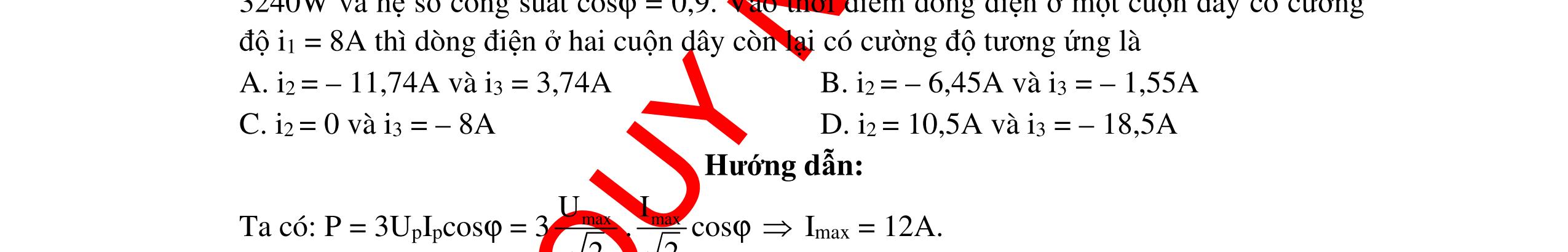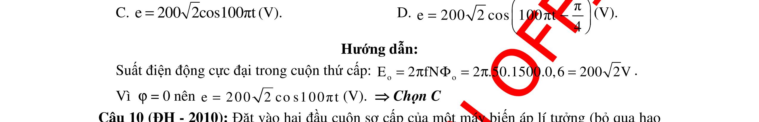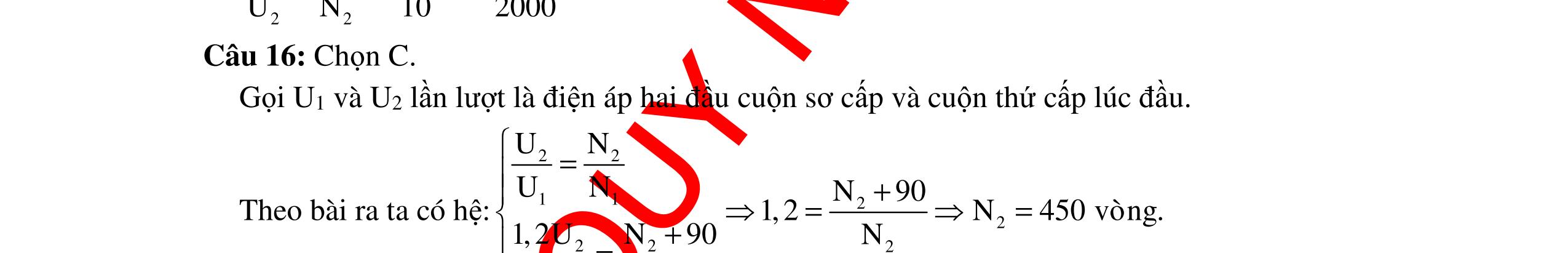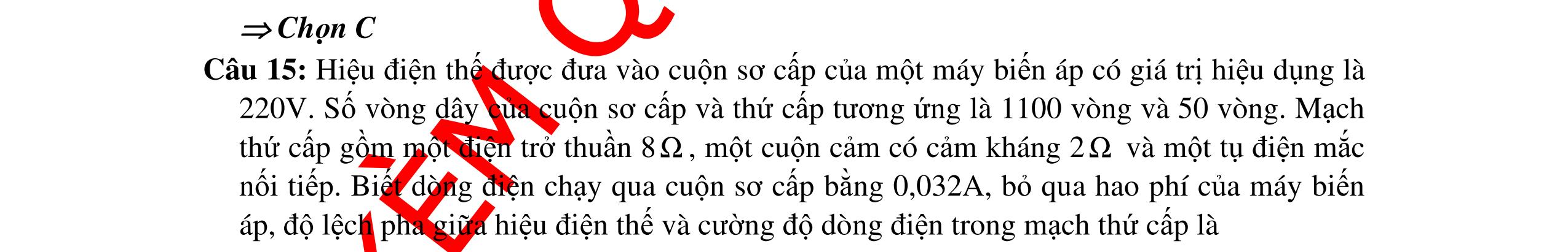 DẠYKÈMQUYNHƠNOFFICIAL 430 Khi 0 'ω=ω thì 1 cos 3 ϕ= và L UU = hay () R R 222 RLCC U1U cosU U 33 2 UUUUU1U 3 ϕ== = =+− =− ()CC 2 LL0 UZ21 1 5 U3Z'LC =−== ω Từ (4), (5) suy ra: () 2 0000 0 0 0 2 ''150'1'577,15 rad/s 3 577,15150105,91 rad/sf16,86Hz 2 ωω−π=ω− ω≈ ω ω=−π≈ =≈ π Câu 98: Chọn D. Ta có: L2C1 12 12 C2L1 1ZZ coscos LCZZ = ωω= ϕ=ϕ = Khi tần số thay đổi: LmaxCmaxmaxUUU == Khi () L2L2max 2 C2L2 C2C2max UIZU 2 ff:ZZ1 23UIZU 3 == = = == Mặt khác: () 2 2 LmaxC2C2L2C2 LRR UZZZZ2 C22 ⇔=−⇔=− Từ (1) và (2) suy ra: L2 Z1,5R = và C2 ZR = Do đó: () () 2 2222 L2C2 RR2 cos 0,894 5RZZR1,5RR ϕ===≈ +−+− Câu 99: Chọn A. Sử dụng công thức giải nhanh ta có P = Pmaxcos2ϕ3 cosϕ3 = 1 2 ϕ3 = π 4 Mặt khác khi chỉnh C đến C1 và C2 thì UC1 = UC2 nên ta có công thức: ϕ3 = ϕ1 + ϕ2 2kết hợp ϕ2 = ϕ1 + π 3 ϕ2 = 5π 12 ϕ1 = π 12 Một công thức giải nhanh khác là UC1 = UCmaxcos(ϕ1 – ϕ3) với tanϕ3 = R ZL 40 = U RR2 + ZL 2.cos(π 4 –π 12) U = 80 6 V. Câu 100: Chọn A.