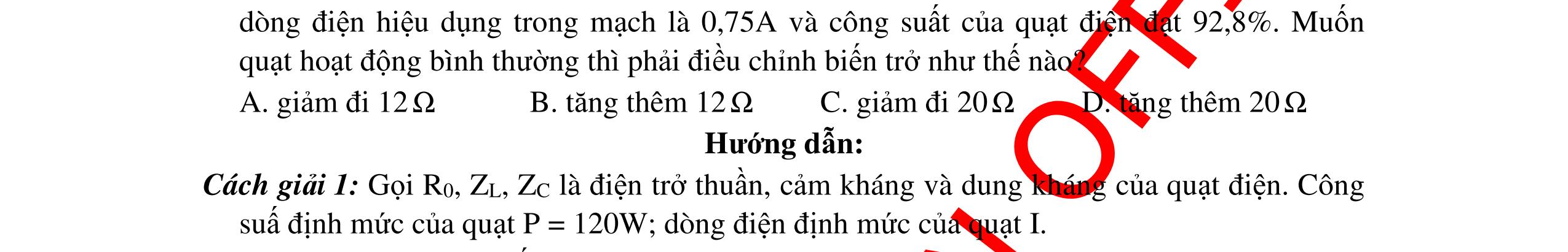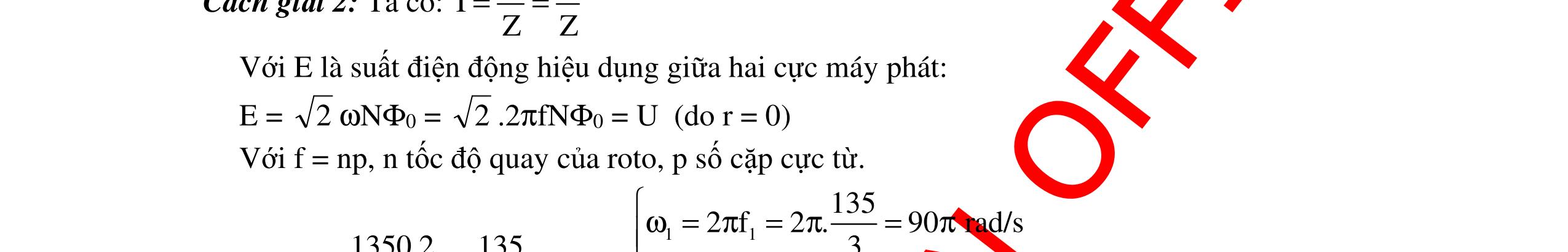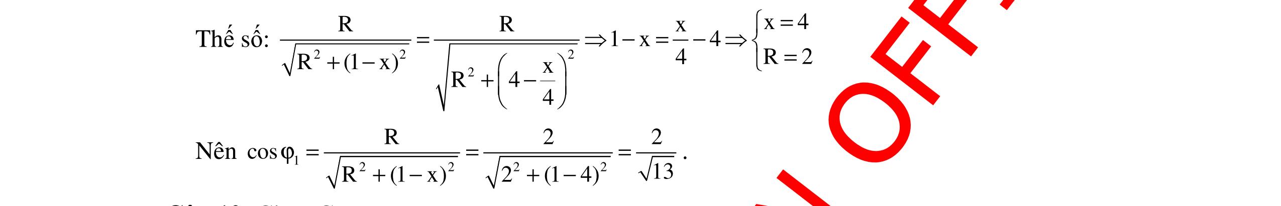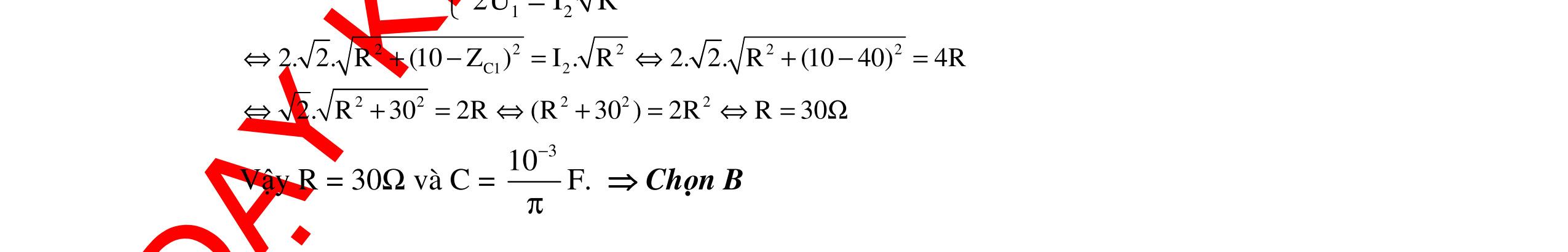 DẠYKÈMQUYNHƠNOFFICIAL 434 b. Tính hệ số công suất của đoạn mạch khi k mở và k đóng. Cách giải 1: Sử dụng công thức: () ϕ== +− 22 LC RR cos ZRZZ Hệ số công suất của đoạn mạch: ϕ=== ϕ=== RR2 cos Z2 R2 RR2 cos Z2 R2 môû môû ñoùng ñoùng Cách giải 2: Sử dụng phương pháp chuẩn hóa số liệu Chọn R = 1 đơn vị điện trở Ta có: === ZZR22. môûñoùng Hệ số công suất của đoạn mạch: ϕ== ϕ== R2 cos Z2 R2 cos Z2 môû môû ñoùng ñoùng Câu 2: Đặt điện áp xoay chiều ổn định vào hai đầu đoạn mạch C mắc nối tiếp gồm điện trở thuần R = 100 Ω, cuộn cảm thuần có cảm kháng ZL và tụ điện có dung kháng ZC thì cường độ dòng điện qua đoạn mạch là ()π =π+ 10 iIcos100tA. 4 Nếu ngắt bỏ cuộn cảm (nối tắt) thì cường độ dòng điện qua đoạn mạch là ()π =π+ 20 3 iIcos100tA. 4 Dung kháng của tụ bằng A. 100 Ω. B. 200 Ω. C. 150 Ω. D. 50 Ω. Hướng dẫn: Ta có: ( ) () =ω+ϕ = +−=+ = 0u 2 222 12LCCLC uUcost(V) Tr−ícvµsaukhimÊtLmµIIRZZRZZ2Z + Trước: ϕ ϕ===α ϕ=α =ω+ϕ−α i1 LCC 1 110u ZZZ tantaniicost RR + Sau: () ϕ ϕ==−α ϕ=−α =ω+ϕ+α i2 C 2220u Z tantaniicost R ϕ−ϕ π α== =α= ==Ωi2i1C C Z tan1ZR100. 24R Chọn A