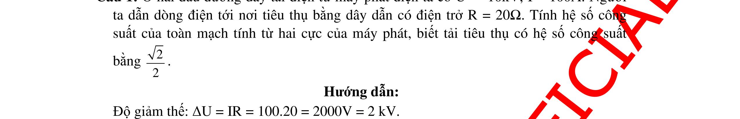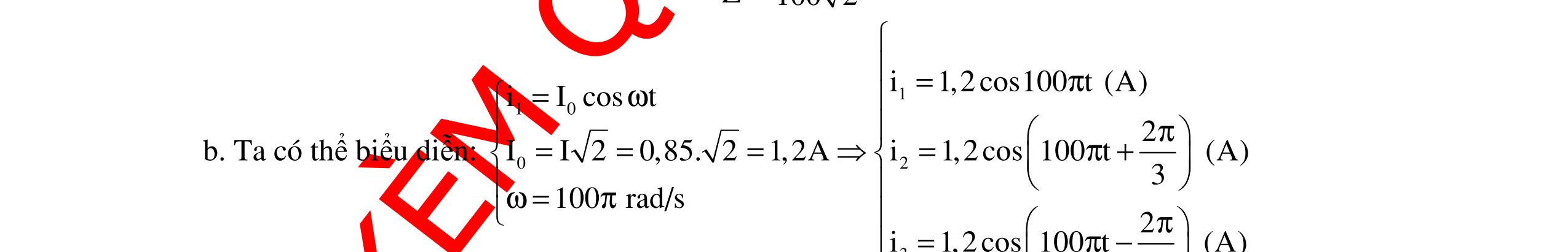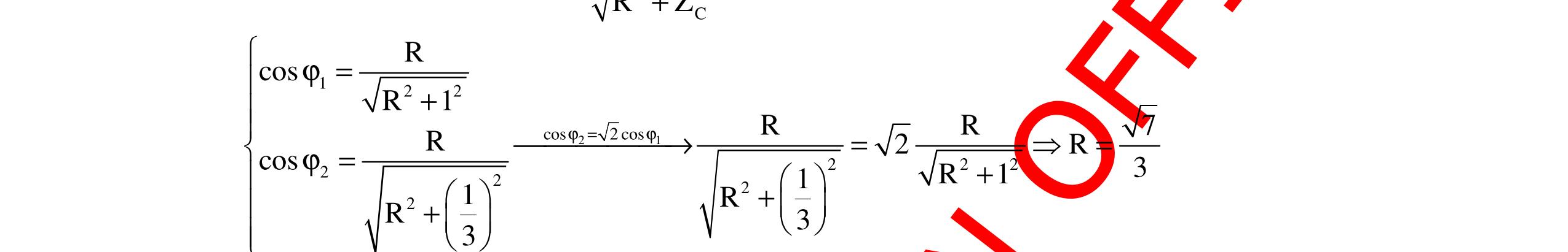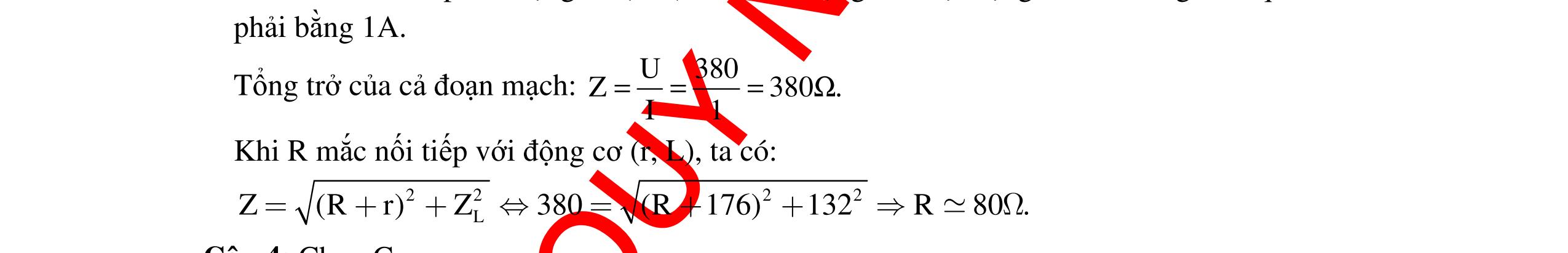 DẠYKÈMQUYNHƠNOFFICIAL 434 b. Tính hệ số công suất của đoạn mạch khi k mở và k đóng. Cách giải 1: Sử dụng công thức: () ϕ== +− 22 LC RR cos ZRZZ Hệ số công suất của đoạn mạch: ϕ=== ϕ=== RR2 cos Z2 R2 RR2 cos Z2 R2 môû môû ñoùng ñoùng Cách giải 2: Sử dụng phương pháp chuẩn hóa số liệu Chọn R = 1 đơn vị điện trở Ta có: === ZZR22. môûñoùng Hệ số công suất của đoạn mạch: ϕ== ϕ== R2 cos Z2 R2 cos Z2 môû môû ñoùng ñoùng Câu 2: Đặt điện áp xoay chiều ổn định vào hai đầu đoạn mạch C mắc nối tiếp gồm điện trở thuần R = 100 Ω, cuộn cảm thuần có cảm kháng ZL và tụ điện có dung kháng ZC thì cường độ dòng điện qua đoạn mạch là ()π =π+ 10 iIcos100tA. 4 Nếu ngắt bỏ cuộn cảm (nối tắt) thì cường độ dòng điện qua đoạn mạch là ()π =π+ 20 3 iIcos100tA. 4 Dung kháng của tụ bằng A. 100 Ω. B. 200 Ω. C. 150 Ω. D. 50 Ω. Hướng dẫn: Ta có: ( ) () =ω+ϕ = +−=+ = 0u 2 222 12LCCLC uUcost(V) Tr−ícvµsaukhimÊtLmµIIRZZRZZ2Z + Trước: ϕ ϕ===α ϕ=α =ω+ϕ−α i1 LCC 1 110u ZZZ tantaniicost RR + Sau: () ϕ ϕ==−α ϕ=−α =ω+ϕ+α i2 C 2220u Z tantaniicost R ϕ−ϕ π α== =α= ==Ωi2i1C C Z tan1ZR100. 24R Chọn A