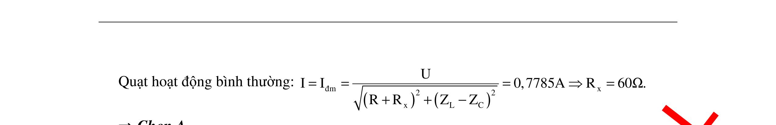 DẠYKÈMQUYNHƠNOFFICIAL 469 Hướng dẫn: Hệ số côngsuất: () ϕ= +− 22 LC R cos RZZ . Tìm tần số khi mạch cộng hưởng ( cos1 ϕ= ) có nghĩa là tìm f, khi đó thì LCZZ = . Ta sẽ chuẩn hóa LC ZZ1 == . Chú ý rằng khi tần số tăng thì ZL tăng đồng thời ZC giảm, vì vậy khitầnsố làf2,f3 thì LCZZ > Giả sử rằng 31 fnfnff50nf50(n1)f. == += =− Nên: 23 1 ff(n1)f f50 3n2. fff ++− ==− Bảngchuẩnhóa f LZ CZ 1f 1 1 ( ) 21 f3n2f =− 3n–2 1 3n2 31ff = n 1 n Phươngán được đưaralàphảitìm đượcn,sau đó suyra 50 f. n1 = Tacó: 2 2 2 3 2 2 R331 cosR3n2 1543n2 R3n2 3n2 R15151 cosRn 1178n Rn n ϕ== =−− +−− ϕ== =− +− ()() 231151 3n2nn13n11n100 43n28n ⇔−−=− −−+= n2f50Hz 5 nf75Hz 3 = = = = Theo đề bàithìf>50 Hz,nêntasẽ chọn f=75Hz. Chọn A Cách giải 2: Vì khi tần số f2, f3 thì LC LC ZZ ZZtan0 R > ϕ=> , nên ta có thể chuyển bài toántừ cosϕ sangtanϕ bằngcôngthứcsau 2 1 tan1 cos ϕ=− ϕ .