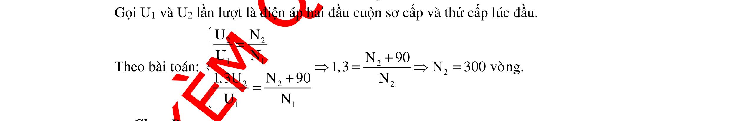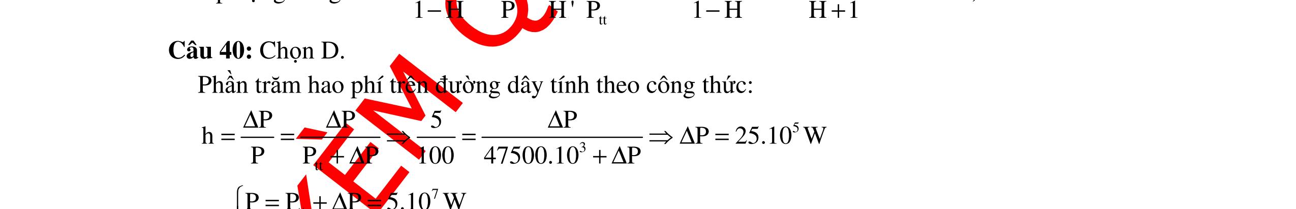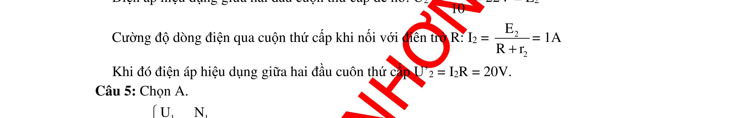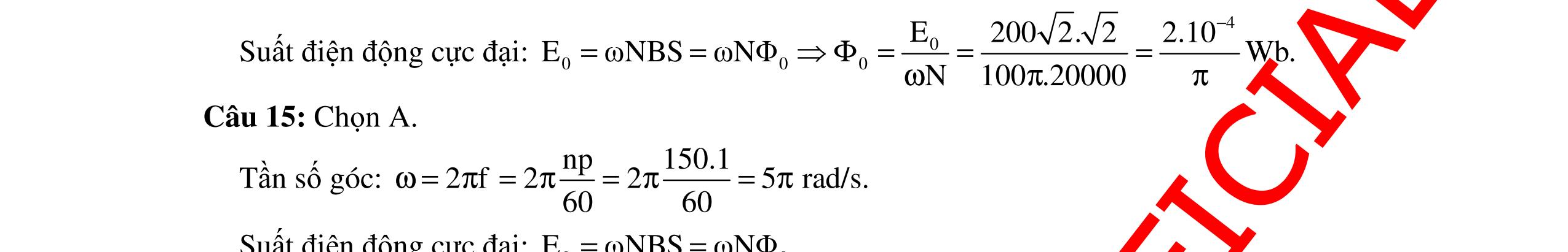 DẠYKÈMQUYNHƠNOFFICIAL 404 Khi điều chỉnh L = L0: Điện áp hiệu dụng đặt vào hai đầu mạch: () 22 R1L1C UUUU50V =+−= Do R1 C L1 L1 C1 U30V Z2R U20V 2R Z U60V 3 = = = = = Khi điều chỉnh L2 = 2L0: L2L1 4R Z2Z 3 == . Khi đó tổng trở của mạch: () 2 2 22 RL2C 4R13 UUUUR2RR 33 =+−=+−= Điện áp hiệu dụng hai đầu điện trở bằng: R2 U150 URV Z 13 == Câu 25: Chọn B. Áp dụng định lý hàm số sin cho tam giác ANB: () RLC RL RL UUU sinsinsin 22 == ππ ϕ−ϕ −ϕ+ϕ Khi C = C0: () () π == ππ ϕ+α −ϕ−α π ϕ=−α = αα 1Cmax RL RL 2 RL 1 UUU sinsinsin 22 21 UU sincos Khi ()1 U470470 CC: 2 sincos2 sin2 2 === π αα −α Khi () ()1 2 2 22 U140U470470 CC: 3 sincossinsin 22 ==== αα+ϕππ −α−ϕ+ϕ Từ (2) và (3) suy ra: 2223α+ϕ=−α ϕ=−α thay vào (1), (2) và (3): 11 UU140cos0,966U470140 sincos2coscos3coscos3U140,3V α= ==== ααααα−α≈ Câu 26: Chọn A. Cảm kháng: L 0,4 ZL100.40. =ω=π=Ω π M A B