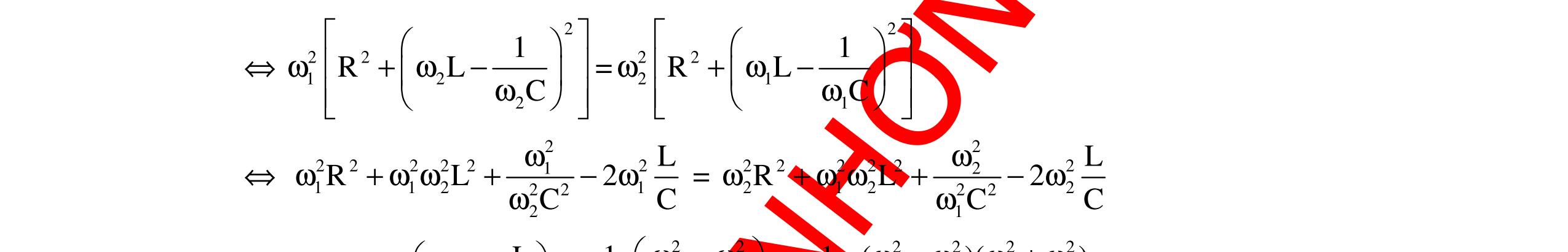 DẠYKÈMQUYNHƠNOFFICIAL 350 Cách giải 1: Ta có khi ω = ω1 và ω = ω2 thì mạch có cùng I với I1 = I2 = I = Imax n (n > 1) với Imax là cường độ cộng hưởng ω1ω2 = ω2 = 1 LC Khi đó R = U Imax = I1Z1 nI1 = Z1 n = R2 + (ZL1 - ZC1)2 n (nR)2 = R2 + Lω1 –1 Cω1 2 (n2 – 1)R2 = (LCω1 2 - 1)2 (Cω1)2 (1) (Thay LC = 1 ω1ω2 và Cω1 = 1 Lω2 vào biểu thức (1)) (1) (n2 – 1)R2 = L2(ω1 – ω2 )2 R = L(ω1 - ω2) n2 - 1 với (ω1 > ω2) Chọn A Chú ý: Tương tự nếu ta viết biểu thức theo C thì ta thay LC = 1 ω1ω2 vào (1) Ta được (n2 – 1)R2 = (ω1 - ω2)2 C2ω1 2ω2 2 R = |ω1 - ω2| Cω1ω2 n2 - 1 . Cách giải 2: Theo giả thuyết: 121212 12 11 IIZZLL CC = = ω−=−ω− ωω 212 1 11 L CLC ω= ωω= ω Mặt khác: max 1 2 2 1 1 I U1U I nnR 1 RL C = = +ω− ω () 2 22222 112 1 1 nRRLRLL C =+ω−=+ω−ω ω () () ( )2 22212 12 2 L n1RLR. n1 ω−ω −=ω−ω = Chọn A Câu 5 (Chuyên Nguyễn Quang Diệu lần 3 – 2014): Đặt điện áp xoay chiều có tần số góc ω thay đổi được vào hai đầu đoạn mạch RLC nối tiếp. Khi thay đổi đổi ω thì cường độ hiệu dụng trong mạch đạt giá trị cực đại là Imax và khi đạt hai giá trị 1ω , 2ω thì cường độ hiệu dụng trong mạch đạt giá trị đều bằng max I 5 . Cho 12 12 ωω 60 ωω C =Ω . Tính R: A. R = 30 Ω B. R = 60Ω C. R = 120 Ω D. R = 100 Ω Hướng dẫn: Ta có: