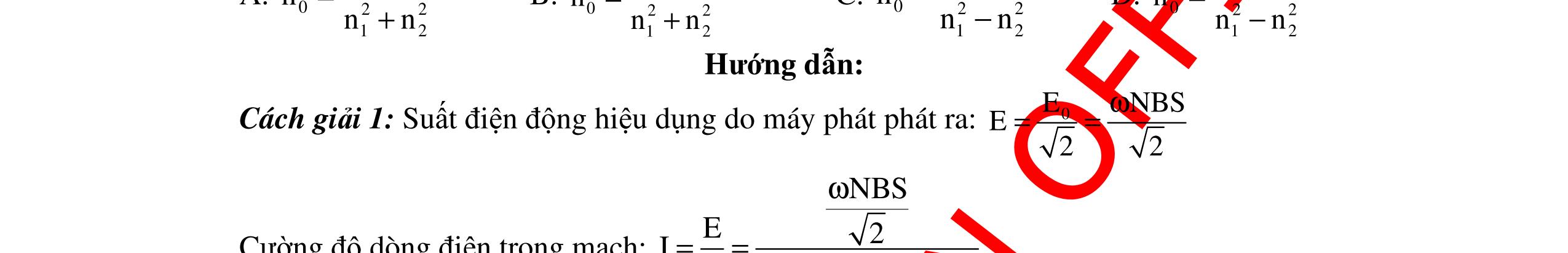 DẠYKÈMQUYNHƠNOFFICIAL 403 () () () () () () 22 2 2 L Cmax 22 2 2 L C L URrZ100602302 U 158V Rr 602 RrZ602302 Z 1502 Z 302 +++ ==≈ + +++ ===Ω Điện dung của tụ: 6 C 1 C15.10F15F. Z ===µ ω Câu 22: Chọn D. Do max 1212min I IIZZnZnR n == === () 2 2 222222 11 1 1 1 11 ZRLnRn1RL CC =+ω−= −=ω− ωω (1) Theo phương pháp đánh giá hàm số, giữa các tần số góc ω1, ω2 và ω0 có mối liên hệ 2 120 ωω=ω mà 2 0 1 LC ω= nên 12 12 11 C LCL ωω= = ωω (2) Từ (1) và (2) ta được: () ()() 2 2222 2 11212 1 12 1 n1RLLLL 1 L −=ω−=ω−ω=ω−ω ω ωω () 22 21212 22 LL RR n1n1 ω−ωω−ω = = Câu 23: Chọn A. Khi C thay đổi để CmaxU thì RL UU ⊥ (URL và U là hai cạnh của tam giác vuông còn CmaxU là cạnh huyền, UR là đường cao thuộc cạnh huyền): 22 RL RL 222 RLR u u 1 U2U2 111 UUU += += += = += 22 RL 222 RL 30010031 U2U2U1003V 111 UU150 Câu 24: Chọn C. N M A B
