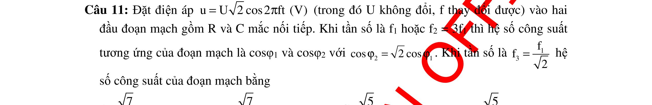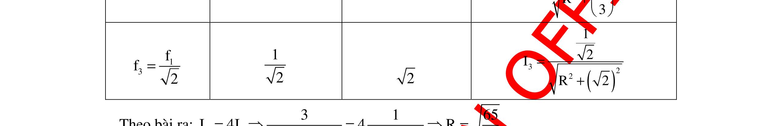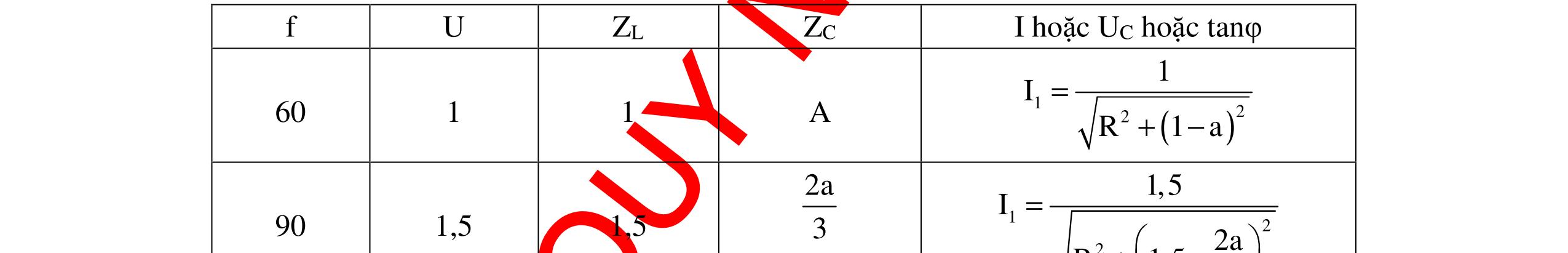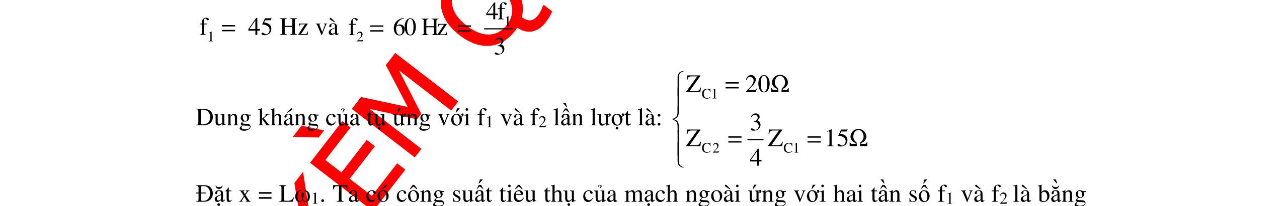 DẠYKÈMQUYNHƠNOFFICIAL 462 Trườnghợp1và2thấy Ibằngnhaunêntacó: () 222 2 2325 R. R2243 R3 3 = = +− +− ĐiệnápMBlệch1350 với điệnápAMnên C 1 1 25 2530 3 ZRf305Hz80Hz. 34f ==⇒=⇒= ≃ Chọn A Cách giải 2: Nếu đề bài cho L =kCR2 vàtại hai giátrị củatần số góc ω1 và ω2 thì mạch sẽ có cùng hệ số công suất. Khi ấy hệ số công suất sẽ được tính bằng công thức: 2 21 12 1 cos 1k ϕ ωω +− ωω Thế số tacó: 22 112 cos 2005011311112502002 ϕ== ππ +−+− ππ Chọn C Câu 12: Cho mạch điện xoay chiều RLC mắc nối tiếp, cuộn dây thuần cảm. Các giá trị của điện trở R, độ tự cảm L điện dung C thỏa điều kiện 4L= CR2 . Đặt vào hai đầu đoạn mạch điện áp xoay chiều ổn định,có tần số thay đổi được(với f<125 Hz).Khi tần số f1 =60 Hz thì hệ số công suất của mạch điện là k. Khi tần số f2 = 120Hz thì hệ số công suất của mạch điện là 21 5 kk 4 = . Khi tần số là f3 thì hệ số công suất của mạch điện là 3 k60 61 = . Giá trị của f3 gần giá trị nào nhất sau đây? A.65Hz. B.80Hz. C.100Hz. D.110Hz. Hướng dẫn: Đâylàdạngtầnsố thay đổiliênquan đếnhệ số côngsuất.Giả sử f3 =nf. Theobài,tỉ lệ giữacáctầnsố vàchọn đạilượngZL để chuẩnhóa,tacóbảngchuẩnhóasau: f ZL ZC f1 1 x f2 =2f1 2 x 2 f3 =nf1 n x n Theo đề:4L=CR2 R2 =4ZLZC (1) Thế vàobiểuthứctổngtrở: 22222 LCLCLCLLCCLC ZR(ZZ)4ZZ(ZZ)Z2ZZZZZ =+−=+−=++=+