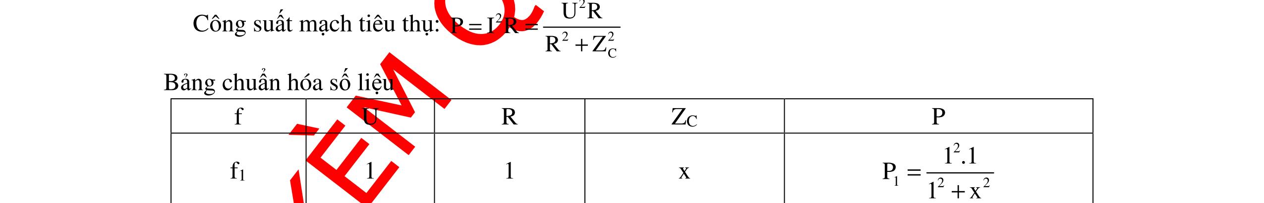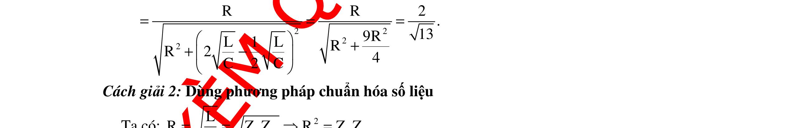 DẠYKÈMQUYNHƠNOFFICIAL 464 Cách giải 2: Phương pháp chuẩn hóa số liệu Nhậnthấytrongtrườnghợp1,hệ số côngsuất bằng1nênlúcnày:ZL =ZC nênchọnbằng 1.Bảngchuẩnhóasố liệunhư sau. Tầnsố Cảmkháng Dungkháng Hệ số côngsuất = 1 f60 Hz 1 1 ϕ= 1 cos1 = 2 f120 Hz 2 0,5 () ϕ= +− 2 22 R cos R20,5 = 3 f90 Hz 1,5 2 3 ϕ= +− 3 2 2 R cos 2 R1,5 3 Theobàira: ϕ= 2 cos0,52 nên () = = +− 22 R 0,52R1,5 R20,5 ϕ=≈ +− 3 2 2 1,5 cos0,874. 2 1,51,5 3 Chọn A Nhận xét: Phương pháp chuẩn hóa số liệu giúp chúng ta đơn giản hóa bước tính toán đến mức tối thiểu. Phương pháp này rất thích hợp với hình thức thi trắc nghiệm đòi hỏi độ nhanh và chính xác cao. Câu 14: Đặt điện áp =π uU2cos2ft (V) (trong đó U không đổi, f thay đổi được) vào hai đầu đoạn mạch gồm R và C mắc nối tiếp. Khi tần số là f1 hoặc = 21 f3f thì cường độ hiệu dụng qua mạch tương ứng là I1 và I2 với = 21 I2I . Khi tần số là = 1 3 f f 2 cường độ hiệu dụngtrongmạchbằng A.0,5I1. B.0,6I1. C.0,8I1. D.0,87I1 Hướng dẫn: Bảngchuẩnhóasố liệu. Tầnsố Dungkháng Hệ số côngsuất 1f 1 = + 1 22 U I R1 2f 1 3 = + 2 2 2 U I 1 R 3 3f 2 () = + 3 2 2 U I R2