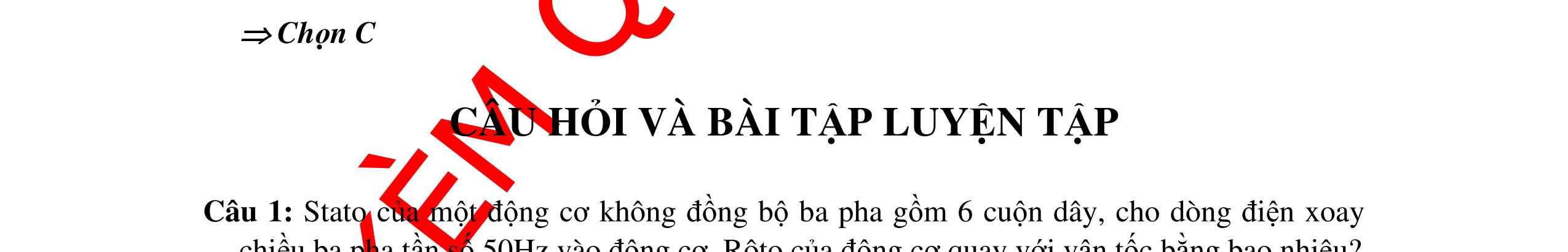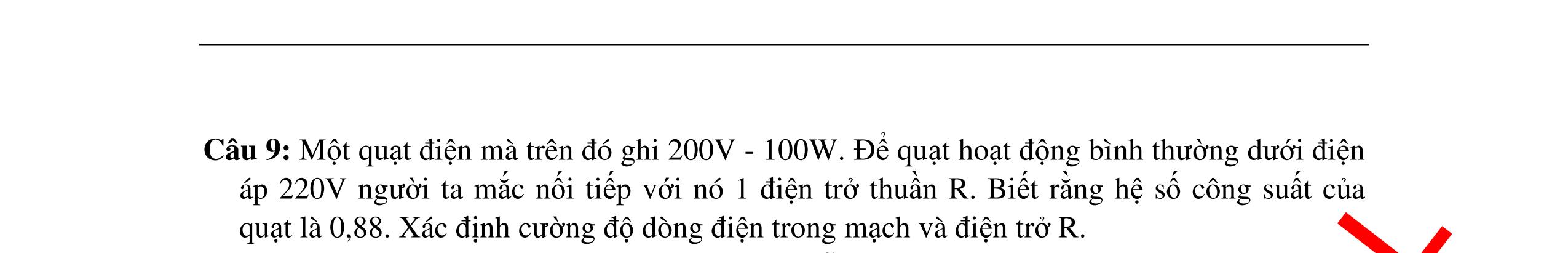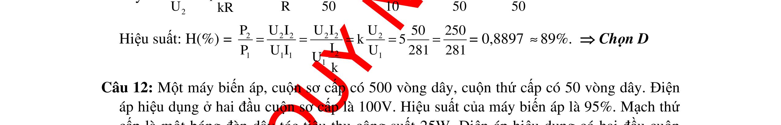 DẠYKÈMQUYNHƠNOFFICIAL 448 ()π =π+ 2 7 i2cos100tA 12 . Nếu đặt điện áp trên vào hai đầu đoạn mạch RLC nối tiếp thìdòng điệntrongmạchcóbiểuthức: A. ()π =π+ i22cos100tA. 3 B. ()π =π+ i2cos100tA. 4 C. ()π =π+ i22cos100tA. 4 D. ()π =π+ i2cos100tA. 3 Câu 5: Cho đoạnmạchxoaychiềuABgồm điệntrở Rvàmộtcuộndâymắcnốitiếp. Điệnáp đặtvàohai đầu đoạnmạchcótầnsố fvàcógiátrị hiệudụngUkhông đổi. Điệnáphai đầu đoạn mạch lệch pha với dòng điện π 4 Để hệ số công suất toàn mạch bằng 1 thì người ta phải mắc nối tiếp với mạch một tụ điện khi đó công suất tiêu thụ trên mạch là200 W.Hỏi khichưamắcthêmtụ thìcôngsuấttiêuthụ trênmạchbằngbaonhiêu? A.100W. B.150W. C.75W. D.170,7W. Câu 6: Đặt điện áp xoay chiều ( )=ω uU2costV vào hai đầu đoạn mạch mắc nối tiếp gồm điệntrở thuầnR,cuộncảmthuầnLvàtụ điệncó điệndungCthay đổi được.Ban đầu điều chỉnh điện dung đến giá trị C1 thì công suất tiêu thụ trong mạch P1,sau đó điều chỉnh điện dung đến giá trị C2 thì công suất tiêu thụ trong mạch là = 21 P1,5P . Khi đó hệ số công suất củamạch đã A.giảm22,47%. B.tăng22,47%. C.tăng60,6%. D.giảm60,6% Câu 7: ĐoạnmạchxoaychiềuABcó điệntrở Rmắcnốitiếpvớicuộndây, điệnáphiệudụng hai đầu cuộn dây vàhai đầu điện trở R cùng giá trị,nhưng lệch pha nhau 3 π .Nếu mắcnối tiếpthêmtụ điệncó điệndungCthìcosϕ =1vàcôngsuấttiêuthụ là100W.Nếukhôngcó tụ thìcôngsuấttiêuthụ củamạchlàbaonhiêu? A.80W B.86,6W C.75W D.70,7W Câu 8: Một đoạn mạch xoay chiều nối tiếp AB gồm điện trở thuần R, tụ điện có dung kháng ZC vàcuộncảmthuầncó cảmkháng LC Z0,5Z. = Khinốihaicựccủatụ điệnmột ampekế có điệntrở rấtnhỏ thìsố chỉ củanólà1Avàdòng điệnquaampekế trễ phasovới điệnáp hai đầu đoạnABlà 4 π .Nếuthayampekế bằngvônkế có điệntrở rấtlớnthìnóchỉ 100V. Giátrị củaRlà A.50 Ω. B.158 Ω. C.100 Ω. D.30 Ω.