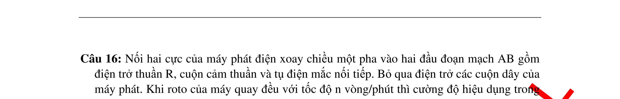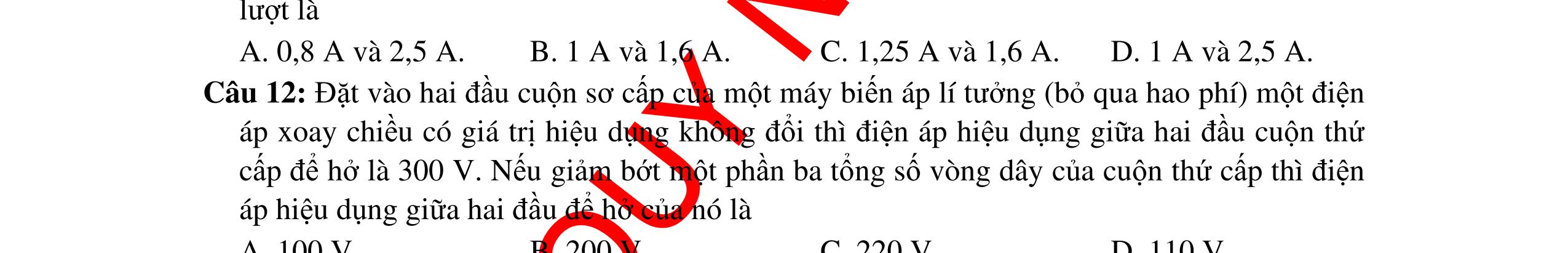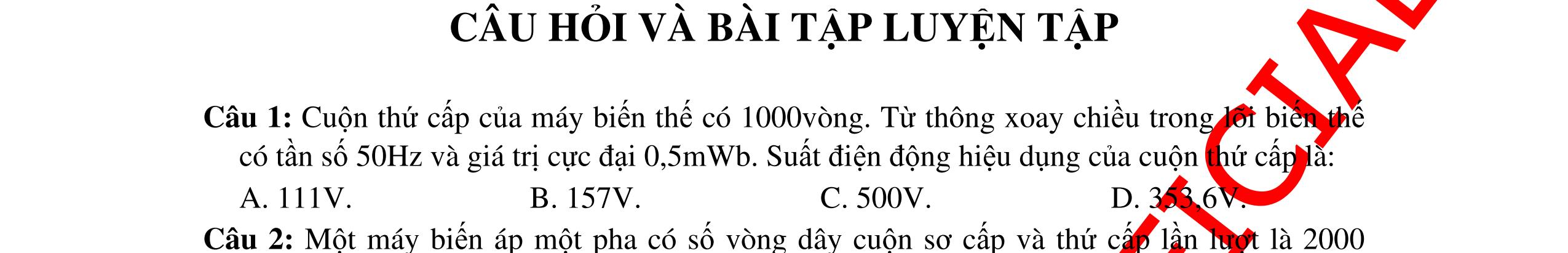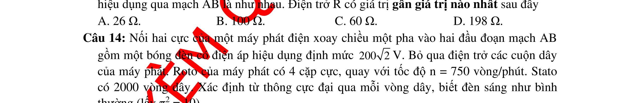 DẠYKÈMQUYNHƠNOFFICIAL 448 ()π =π+ 2 7 i2cos100tA 12 . Nếu đặt điện áp trên vào hai đầu đoạn mạch RLC nối tiếp thìdòng điệntrongmạchcóbiểuthức: A. ()π =π+ i22cos100tA. 3 B. ()π =π+ i2cos100tA. 4 C. ()π =π+ i22cos100tA. 4 D. ()π =π+ i2cos100tA. 3 Câu 5: Cho đoạnmạchxoaychiềuABgồm điệntrở Rvàmộtcuộndâymắcnốitiếp. Điệnáp đặtvàohai đầu đoạnmạchcótầnsố fvàcógiátrị hiệudụngUkhông đổi. Điệnáphai đầu đoạn mạch lệch pha với dòng điện π 4 Để hệ số công suất toàn mạch bằng 1 thì người ta phải mắc nối tiếp với mạch một tụ điện khi đó công suất tiêu thụ trên mạch là200 W.Hỏi khichưamắcthêmtụ thìcôngsuấttiêuthụ trênmạchbằngbaonhiêu? A.100W. B.150W. C.75W. D.170,7W. Câu 6: Đặt điện áp xoay chiều ( )=ω uU2costV vào hai đầu đoạn mạch mắc nối tiếp gồm điệntrở thuầnR,cuộncảmthuầnLvàtụ điệncó điệndungCthay đổi được.Ban đầu điều chỉnh điện dung đến giá trị C1 thì công suất tiêu thụ trong mạch P1,sau đó điều chỉnh điện dung đến giá trị C2 thì công suất tiêu thụ trong mạch là = 21 P1,5P . Khi đó hệ số công suất củamạch đã A.giảm22,47%. B.tăng22,47%. C.tăng60,6%. D.giảm60,6% Câu 7: ĐoạnmạchxoaychiềuABcó điệntrở Rmắcnốitiếpvớicuộndây, điệnáphiệudụng hai đầu cuộn dây vàhai đầu điện trở R cùng giá trị,nhưng lệch pha nhau 3 π .Nếu mắcnối tiếpthêmtụ điệncó điệndungCthìcosϕ =1vàcôngsuấttiêuthụ là100W.Nếukhôngcó tụ thìcôngsuấttiêuthụ củamạchlàbaonhiêu? A.80W B.86,6W C.75W D.70,7W Câu 8: Một đoạn mạch xoay chiều nối tiếp AB gồm điện trở thuần R, tụ điện có dung kháng ZC vàcuộncảmthuầncó cảmkháng LC Z0,5Z. = Khinốihaicựccủatụ điệnmột ampekế có điệntrở rấtnhỏ thìsố chỉ củanólà1Avàdòng điệnquaampekế trễ phasovới điệnáp hai đầu đoạnABlà 4 π .Nếuthayampekế bằngvônkế có điệntrở rấtlớnthìnóchỉ 100V. Giátrị củaRlà A.50 Ω. B.158 Ω. C.100 Ω. D.30 Ω.