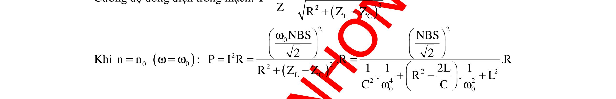 DẠYKÈMQUYNHƠNOFFICIAL 342 Ta có: L LC C ZL L 1ZZ5000ZC C =ω == = ω ω’ = 1 L(CC) +∆ = 80π L(C + ∆C) = 2 1 (80) π 5000C(C + ∆C) = 2 1 (80) π C2 + (∆C)C – 2 1 (80).5000 π = 0 C2 + 30,125.10 π C – 2 1 (80).5000 π = 0 C2 + 310 8π C –6 2 10 8.4 π = 0 C = 310 8π F Suy ra: ZC = 1 Cω = 100 Ω ω = ZC C 1 = 80π rad/s. Chọn A III. Sự thay đổi ω ωω ω trong mạch RLC mắc nối tiếp Xét mạch điện xoay chiều có hiệu hiệu thế hai đầu ổn định: 0u uUcos(t) =ω+ϕ . ω có giá trị thay đổi; R, L và C không đổi. 1. Khảo sát sự biến thiên công suất theo ω ωω ω. Ta có: 2 2 2 2 UR PIR 1 RL C == +ω− ω Việc khảo sát hàm số P theo biến số ω bằng việc lấy đạo hàm và lập bảng biến thiên rất khó khăn vì hàm số này tương đối phức tạp. Tuy nhiên, ta có thể thu được kết quả đó từ những nhận xét sau: Khi ω = 0 thì C 1 Z C =→∞ ω làm cho P = 0. Khi 0 1 LC ω=ω= thì mạch cộng hưởng làm cho công suất trên mạch cực đại. Khi ω→∞ thì L ZL=ω→∞ làm cho P = 0. Từ những nhận xét đó ta dễ dàng thu được sự biến thiên và đồ thị: ω ∞ 0 0 1 LC ω=ω= +∞ ( )P' ω - 0 + ( )P ω = 2 max U P R 0 0 0 ω P Pmax