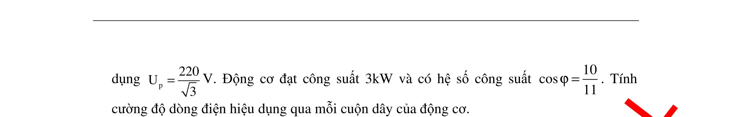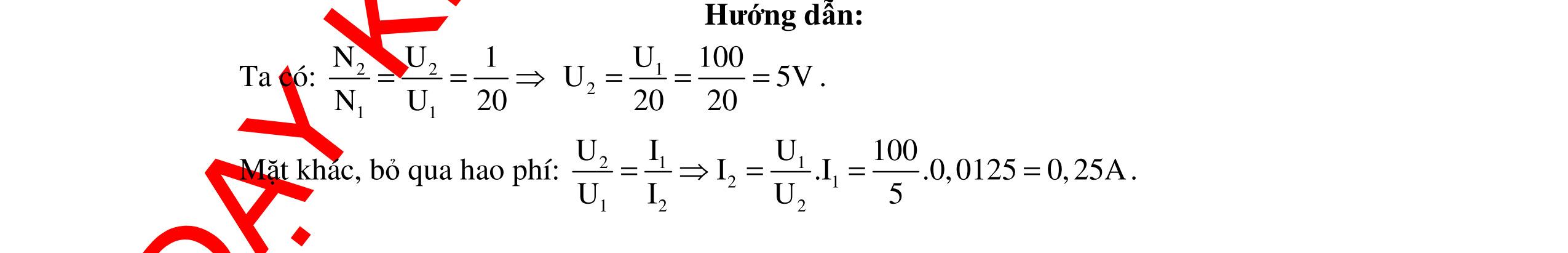 DẠYKÈMQUYNHƠNOFFICIAL 436 BÀI TẬP VẬN DỤNG Câu 1: Đoạn mạch không phân nhánh RLC đặt dưới điện áp xoay chiều ổn định thì cường độ hiệu dụng, công suất và hệ số công suất của mạch lần lượt là 3 A, 90 W và 0,6. Khi thay LC bằng L’C’ thì hệ số công suất của mạch là 0,8. Tính cường độ hiệu dụng và công suất mạch tiêu thụ Hướng dẫn: Từ công thức: Từ công thức: ϕ =ϕ = = = ϕ 2 22 2 222 2 11 PcosP PcosU0,8 P160W. RPcos900,6 Câu 2 (THPT Lý Thái Tổ, Bắc Ninh lần 2 - 2016): Cho mạch điện như hình vẽ. Điện áp xoay chiều ổn định giữa hai đầu A và B là u = 1006 cos( t ω+ϕ ) (V). Khi K mở hoặc đóng, thì đồ thị cường độ dòng điện qua mạch theo thời gian tương ứng là im và iđ được biểu diễn như hình bên. Điện trở các dây nối rất nhỏ. Giá trị của R bằng: A. 100Ω. B.50 2 Ω. C. 100 2 Ω. D. 100 3 Ω Hướng dẫn: I1 = Im ; I 2 = Iđ (K đóng) Cách giải 1: Dùng giản đồ véctơ kép Dựa vào đồ thị ta thấy 1 chu kì 12 ô và hai dòng điện lệch pha nhau 3 ô hay T 4 về pha là 2 π (vuông pha). Ta có: m I3I = ñ R2R1U3U = . Dựa vào giản đồ véctơ hình chữ nhật ta có: LC1R2R1 UU3U == (1) 222 R1R2 UU(1003) += (2) Từ (1) và (2) suy ra: 222 R1R1R1 U(3U)(1003)U503V += = Hay R2R1 U3U3.503150V === Giá trị của R: R1 m R2 U R I U R I = = ñ . Thế số: R1 m U5032 R502 I 3 ===Ω Chọn B K M N LR C BA mI ABU F R2U C2U LC1U UA B E I ñ R1U Iđ t(s) 3 0 i(A) 3 Im 3 3