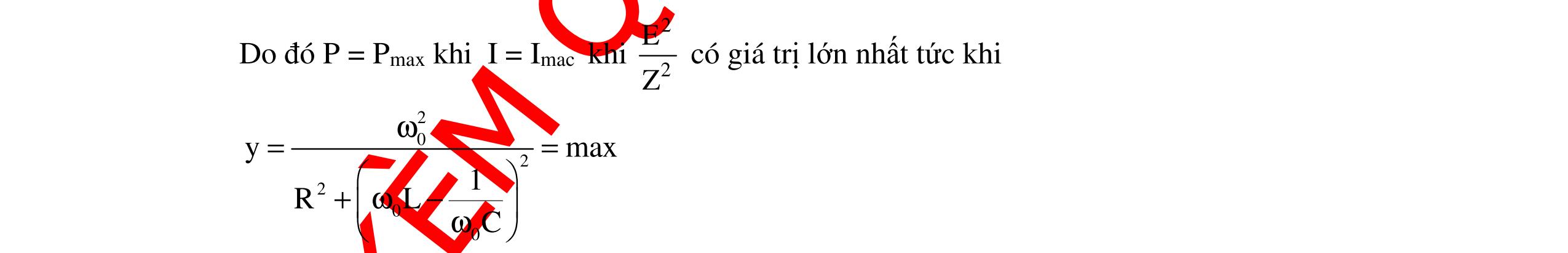 DẠYKÈMQUYNHƠNOFFICIAL 343 Nhận xét đồ thị: Từ đồ thị ta thấy rằng sẽ có hai giá trị ω1 ≠ ω2 cho cùng một giá trị công suất, điều này phù hợp với những biến đổi ở phần trên. 2. Giá trị ω ωω làm cho Pmax, Imax, Umax Ta có 2 2 2 2 UR PIR 1 RL C == +ω− ω , từ công thức này ta thấy rằng công suất của mạch đạt giá trị cực đại khi: 0 11 L0 C LC ω−= ω=ω= ω . Với = 2 max U P R Khi đó Zmin = R và hiệu điện thế giữa hai đầu mạch và cường độ dòng điện qua mạch đồng pha nhau. 3. Có hai giá trị ω ω1 ≠ ≠≠ ≠ ω ωω2 cho cùng công suất (cộng hưởng) và giá trị ω ω làm cho Pmax tính theo ω ωω ω1 và ω ωω ω2 Nếu có hai giá trị tần số khác nhau cho một giá trị công suất thì: 22 22 22 12 12 URUR 11 RLRL CC =⇔= +ω−+ω− ωω 12P P 22 22 12 12 11 RLRL CC ⇔+ω−=+ω− ωω 22 12 12 12 12 12 12 11 LL(1) 11CC LL CC11L(L)(2) CC ω−=ω− ωω ⇔ω−=ω−⇔ ωω ω−=−ω− ωω Vì ω1 ≠ ω2 nên nghiệm (1) bị loại. Khai triển nghiệm (2) ta thu được : 12 1 LC ωω= Có hai giá trị của ω để mạch có P, I, Z, cosφ, UR giống nhau thì: 2 12ch 1 LC ωω=ω= Với ω = ω1 hoặc ω = ω2 thì I hoặc P hoặc cosφ hoặc UR có cùng một giá trị thì: Imax hoặc Pmax hoặc UR max khi 1212 1 LC ω=ωω =ωω hay 12fff = . 4. Giá trị ω ωω làm cho hiệu điện thế ULmax