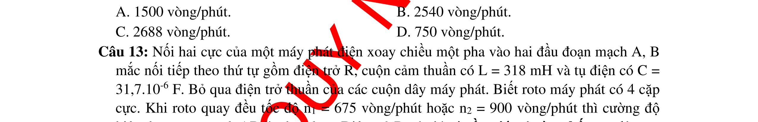 DẠYKÈMQUYNHƠNOFFICIAL 393 1 302ω=π rad/s hoặc 1 402ω=π rad/s thì điện áp hiệu dụng trên cuộn dây có giá trị bằngnhau.Giátrị củaUL max là: A. 1205V B. 1502V C. 1203V D. 1002V Câu 81: Đặt một điện áp xoay chiều 0 uUcos100t =π (V) vào đoạn mạch RLC có R1002 = Ω, cuộn cảm thuần có độ tự cảm L < 1,5π H và tụ điện có điện dung C thay đổi được. Khi điện dung tụ điện lần lượt là 1 25 CF =µ π và 2 125 CF 3 =µ π thì điện áp hiệu dụng trên tụ có cùnggiátrị. Để UR max thì giátrị củaC là A. 50 π µF. B. 200 3π µF. C. 20 π µF. D. 100 π µF. Câu 82: Cho đoạn mạch AB gồm 2 hộp đen X, Y nối tiếp (trong mỗi hộp chỉ chứa 1 trong các phần tử: điện trở thuần, cuộn dây hoặc tụ điện). Đặt vào 2 đầu mạch điện áp u = 100 6 cos2πft (V). Ban đầu, f = f1 thì điện áp hiệu dụng hai đầu các hộp đen X, Y lần lượt là UX = 100V, UY = 200V. Sau đó, nếu tăng f thì cường độ dòng điện hiệu dụng I qua mạch giảm. Hệ số côngsuấtcủamạchlúc đầu A. 2 2 . B. 1 3 . C. 1. D. 3 2 Câu 83: Đặt điện áp xoay chiều vào hai đầu đoạn mạch AB nối tiếp gồm điện trở R, cuộn dây cảm thuần L và tụ điện có điện dung C thay đổi được. Khi C = C1 thì dòng điện trễ pha 4 π so với điện áp hai đầu đoạn mạch. Khi 1C C 6,25 = thì UC max. Tính hệ số công suất mạch AB khi đó. A.0,6. B.0,7. C.0,8. D.0,9. Câu 84: Cho mạch điện RLC, với C thay đổi được. Điện áp đặt vào hai đầu đoạn mạch có dạng uU2cost (V).=ω Cảm kháng 2 LH π = . Khi 4 1 10 CCF == π thì cường độ dòng điện i trễ pha π 4 sovới u.Khi 4 2 10 CCF 2,5 == π thìUC max.Giátrị củatầnsố góc ω . A. 200π rad/s B. 50π rad/s C. 10π rad/s D. 100π rad/s Câu 85: Đặt điện áp xoay chiều vào hai đầu đoạn mạch AB nối tiếp gồm điện trở R, cuộn dây cảm thuần 2 L = π H và tụ điện có điện dung C thay đổi được. Khi 1 CC0,1 == π mF thì dòng điện trễ pha 4 π so với điện áp hai đầu đoạn mạch. Khi 1C C 2,5 = thì UC max. Tính tần số góc củadòng điện. A.200π rad/s. B.50π rad/s. C.100π rad/s. D.10π rad/s.
