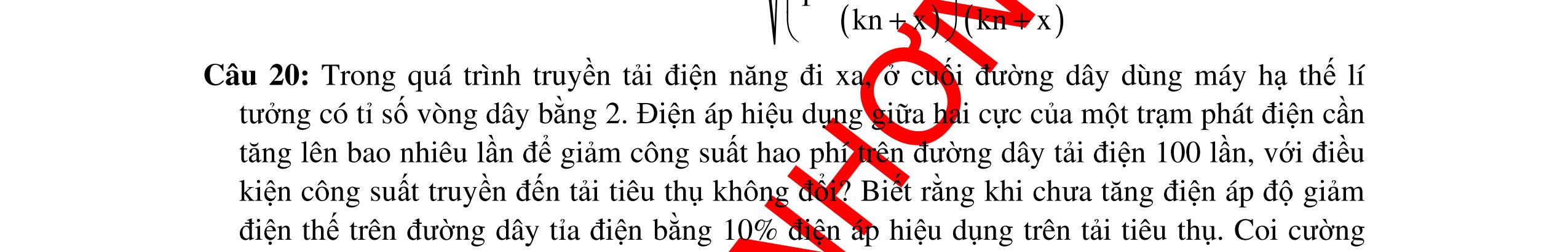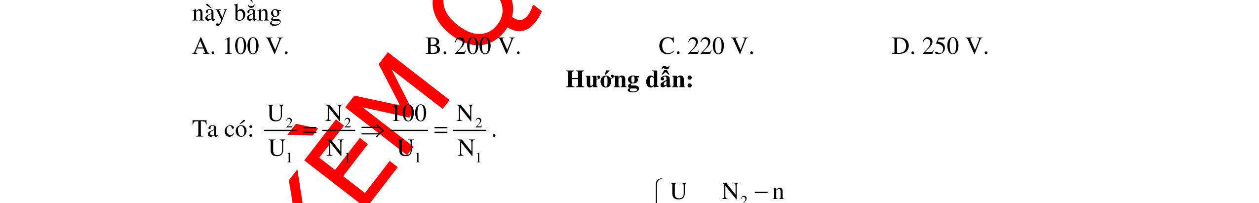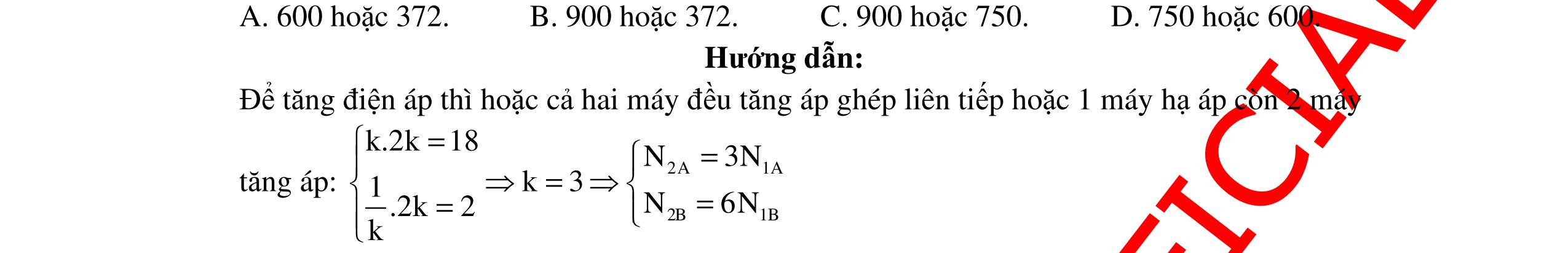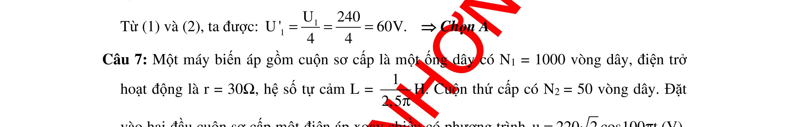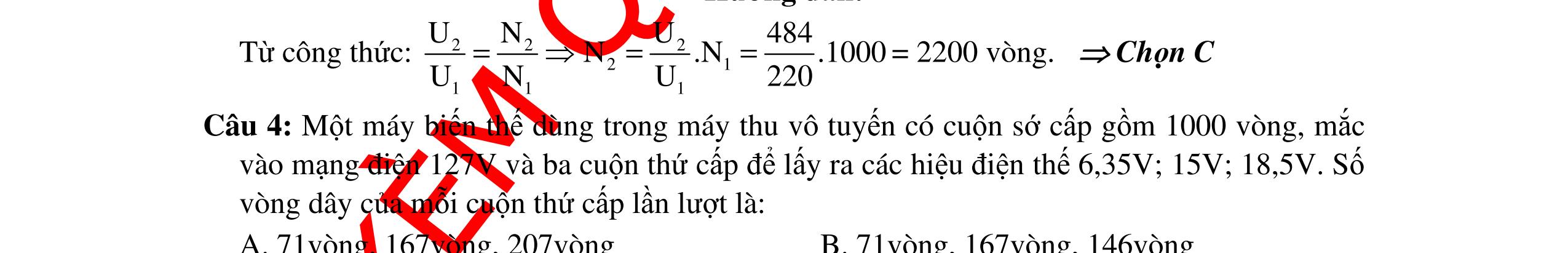 DẠYKÈMQUYNHƠNOFFICIAL 432 2 LL LC L x1 ZZZZtan0,752 RxZ + ϕ=⇔−= () L 2 CLL R2Z x22 21 ZZ2,5Z 2 = = + == Khi f = f0 + 45 Hz thì UL = U nên () ()2 2222 LLCC L Z'RZ'Z'Z'2R 3 C =+− =− Từ (1) và (3) ( )LC ZZ'4 = Thay (4) vào (2): ()CC 0 00 11 Z2,5Z'2,5.f30Hz. 2f2f45 =⇔= = ππ+ Thay f0 = 30 Hz vào (2), ta được: ()() 211 2,5.100L2,5605 60CLC =π =π π Khi đó: () 22 C AMRC 22 LC RZ UIZUR RZZ + ==∉ +− ()() 2 LC 1 Z2Z0,52f6 LC ⇔=⇔=π Thay (5) vào (6): ( ) ( ) 22 0,52f2,560f305Hz π=π = . Câu 104: Chọn D. Từ công thức: 22 C LC,Lmax U 1 U ω += ω 222U 1U223,6V. 3300 += ≈