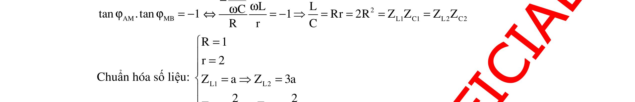 DẠYKÈMQUYNHƠNOFFICIAL 425 Ta có: C1 6 1 C2 6 2 11 Z400 C25.10 100. 11 Z240 C125.10 100. 3 ===Ω ω π π ===Ω ω π π Theo giả thuyết: () () C CC 22 22 LC LL 2 CC UZU UIZ RZZ11RZ2Z1 ZZ === +− +−+ UC phụ thuộc C 1 Z theo kiểu hàm tam thức bậc 2 nên: C1C2L 22 C0L 11 1ZZZ Z2RZ + == + L 22L L Z 1 Z100. RZ300 = =Ω + Vậy: RmaxCL C 1100 UZZ100CF Z ⇔== ==µ ωπ . Câu 82: Chọn B. Vì UY – UX = 100V và U = 1003 V nên mạch không thể chứa LC. Khi f tăng I giảm nên mạch chứa RL. Giả sử: UY = UR R U2 cos1 U3 ϕ==> (loại) Vậy: UX = UR=100V R U1 cos1 U3 ϕ==< Câu 83: Chọn C. Khi LC1 11 LC1 ZZ CCtantanRZZ R4 π = ϕ== =− Khi () C2C1 12222 LLC1L CmaxC2C1 L L Z6,25Z C C ZZZRZ6,25 UZ6,25Z ZZ = = −+ + ⇔= = C1L LL C1 L C2 Z8Z Z3Z ZR 44 25Z Z 16 = = = = Hệ số công suất mạch AB khi đó: