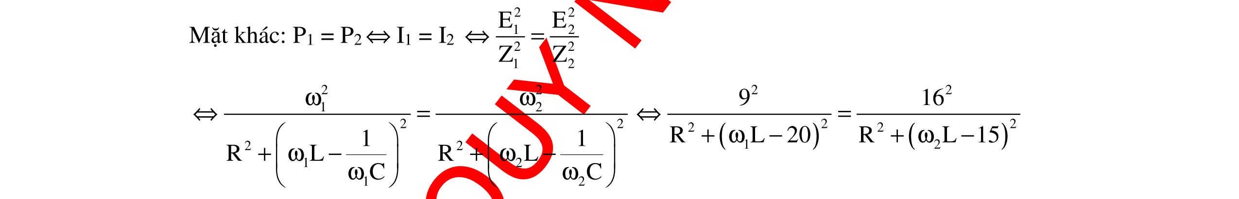 DẠYKÈMQUYNHƠNOFFICIAL 346 L0C0L02222 L0L0C0L0L0C0 ZZZ .1ZZZRZRZZ RR =−⇔−=− += (1) Lúc sau tăng ω = 2ω0 thì LL0 CC0 Z2Z 1 ZZ 2 = = (2) Mà Z = 22 LC R(ZZ) +− = 222 LLCC RZ2ZZZ +−+ (3) Thế (1) vào (2) ta được: Z0 = 2 C0L0C0ZZZ (4) Ta có lúc đầu : UMB0 = I0ZC0 = C0 0 U Z Z = C0 22 L0C0 UZ R(ZZ) +− (5) Ta có lúc sau : UMB = IZC = C U Z Z = C 22 LC UZ R(ZZ) +− (6) Thế (2) vào (6): UMB = C0 2 2 L0C0 UZ 1 2R2ZZ 2 +− = C0 222 L0L0C0C0 UZ 1 2R4Z2ZZZ 4 +−+ = C0 222 L0L0C0C0 UZ 4R(16Z8ZZZ) +−+ (7) Thế (1) vào (7): UMB = C0 222 L0L0C0C0 UZ 4R(16Z8ZZZ) +−+ Mặt khác: UMB= 2 U 1LC −ω . Khi ω tăng 2 lần thì ω2 tăng 4 lần. Suy ra mẫu số giảm nên UMB tăng. Chọn C Câu 2: Đặt điện áp xoay chiều u = U0cosωt có U0 không đổi và ω thay đổi được vào hai đầu đoạn mạch có R, L, C mắc nối tiếp. Thay đổi ω thì cường độ dòng điện hiệu dụng trong mạch khi ω = ω1 bằng cường độ dòng điện hiệu dụng trong mạch khi ω = ω2. Hệ thức đúng là: A. 12 2 LC ω+ω= . B. 12 1 . LC ωω= . C. 12 2 LC ω+ω= . D. 12 1 LC ωω= Hướng dẫn: Cách giải 1: Ta có: () ()1122 12 2222 LCLC UU II RZZRZZ =⇔= +−+− ( ) ( )1122 22 LCLC ZZZZ ⇔−=− Vậy xảy ra 2 khả năng, biến đổi ta được: