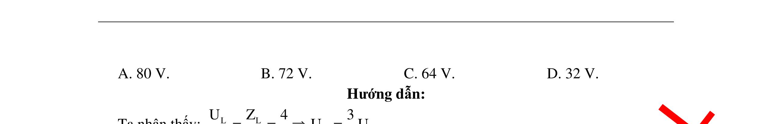 DẠYKÈMQUYNHƠNOFFICIAL 318 ()2 222222 LCCLLCCC 33 RZZZRZ2ZZZZ0 44 ⇔+−=⇔+−+−= 22 LLCCLC 33 ZZZZ0ZZ 42 ⇔−−=⇔= Vậy CLmaxC LmaxLC CLC UUU 3 UZU300V. ZZZ2 =⇔=== Chọn A Câu 13: Đặt điện áp xoay chiều u = U0cos100πt (V) vào hai đầu đoạn mạch mắc nối tiếp gồm R, C và cuôn dây thuần cảm L thay đổi được. Điều chỉnh L để điện áp hiệu dụng ở hai đầu L đạt giá trị cực đại và bằng 100V, khi đó điện áp 2 đầu tụ bằng 36V. Giá trị hiệu dụng 2 đầu đoạn mạch là: A. 64V B. 80V C. 48V D. 136V Hướng dẫn: Cách giải 1: Điều chỉnh L để điện áp hiệu dụng ở hai đầu L đạt giá trị cực đại 22 C 22 LmaxLmaxRC R RZ U UUUUU RU + =⇔=+ Mạch RLC (cuộn dây thuần cảm) có L thay đổi và UL max thì taluôn luôn có: 22 LCRC UUUU =+ và 22 LmaxRC R U UUU U =+ Tadùng công thức: 22 LCRC UUUU =+ suy raUR =48V. Từ công thức: 2222 LmaxRC R UU UUU1004836U80V. U48 =+⇔=+ = Chọn B Cách giải 2: Khi L biến thiên màULmax tacó giản đồ như hình bên. Theo hệ thứclượng củatam giácvuông tacó: =80(V). Chọn B Câu 14: Đoạn mạch xoay chiều AB gồm điện trở R nối tiếp cuộn dây thuần cảm có L thay đổi được, điện áp hai đầu cuộn cảm được đo bằng một vôn kế có điện trở rất lớn. Khi L = L1 thì vôn kế chỉ V1, độ lệch pha giữa điện áp hai đầu đoạn mạch với dòng điện là ϕ1, công suất của mạch là P1. Khi L = L2 thì vôn kế chỉ V2, độ lệch pha giữa điện áp hai đầu đoạn mạch và dòng điện là ϕ2, công suất của mạch là P2. Biết ϕ1 + ϕ2 = 2 π và V1 = 2V2. Tỉ số 2 1 P P là: A. 4 B. 6 C. 5 D. 8 2 RCCL 222 RCL UU.U UUU = =− 2 LCLUUUU =− LU RU CU U