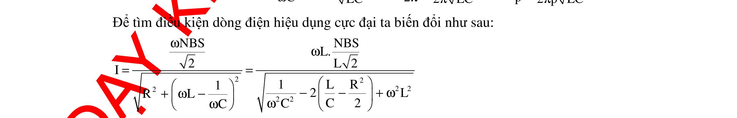 DẠYKÈMQUYNHƠNOFFICIAL 344 Ta có: () L LL 2 22 LC 22422 UZ UU UIZ RZZ11R21y 1 LCLLC ==== +− +−+ ωω Nhận thấy LmaxminUy ⇔ Xét hàm số 2 22422 11R21 y1 LCLLC =+−+ ωω là một hàm bậc hai theo biến 2 1 ω và 22 1 a0 LC => nên hàm số đạt cực tiểu tại: ( )2 2L 22 2 2LRCC 1b212 2Lω 2a22LCRCC R C =−= ω== Tần số góc: 2 2 L 222 L 21LR C 2LCRCC2 ω= =− −ω () 222 2 22CLCCLC L 1LRRR ZZZZZZ CC222 ⇔=−⇔=−⇔−= ω ( )CLC CLC 2RC ZZZ ZZZ 111 tantan. R2RR22 ⇔=⇔=⇔ϕϕ= Và 22 222 242 min 2 22 R21 4 LLCLC 4RLCRC y 1 4a4L 4 LC ∆− =−=−= Khi đó: Lmax 24224222 min 2 UU2UL2UL U y 4RLCRC4RLCRCR4LCRC 4L ==== Hay Lmax 22 2 C 444422 2 L UUU U . 1 LCZ11 1 LCLC Z === ωω 5. Giá trị ω ωω làm cho hiệu điện thế UCmax Ta có : () () C CC 2 2224222 LC UZ UU UIZ RZZLCRC2LC1y ==== +−ω+−ω+ Nhận thấy CmaxminUy ⇔ . Xét hàm số ( ) 224222 yLCRC2LC1 =ω+−ω+ là một hàm bậc hai theo biến 2 ω và 22 aLC0 => nên hàm số đạt cực tiểu tại: