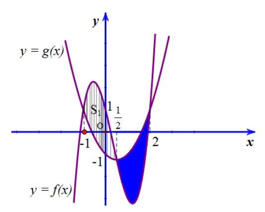 )ygx = có đồ thị như hình vẽ. Biết đồ thị ( )yfx = và ( )ygx = cắt nhau tại ba điểm phân biệt ,, ABC có hoành độ lần lượt là 2;1;2 và thỏa mãn 35 2 AB = . Tính diện tích hình phẳng giới hạn bởi hai đồ thị ( )yfx = và ( )ygx = A. 71 3 B. 238 3 C. 71 6 D. 13 4 Lời giải Chọn C Ta có: ( ) ( ) ( ) ( ) ( ) ( ) ( ) ( )2 2 2 2;,1;1221 AB AfxBfxABff −=++−− Theo giả thiết ( ) ( ) 353 21 22ABff=−−= . ( ) 13 822 22 acdacd −−−+−−++= 31 ac +=− . Mặt khác, ( ) ( ) ( )( )( ) ( ) 32 21244 fxgxaxxxaxxx −=+−−=−−+ Nhận xét do đồ thị ( )ygx = là parabol nhận Oy làm trục đối xứng ( ) 2 gxkxm=+ Đồng nhất hệ số của phương trình ( )* ta có: 4 ca =− Từ, suy ra 311 44 aca cac +=−= =−=− . Vậy ( ) ( ) 32 44fxgxxxx −=−−+ . Vậy ( ) ( ) 2 2 71 6 Sfxgxdx =−=