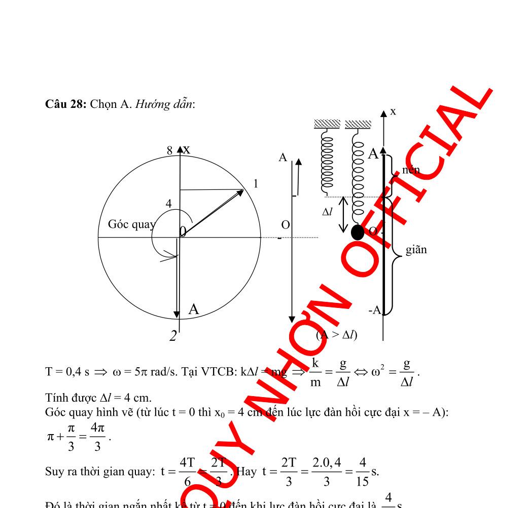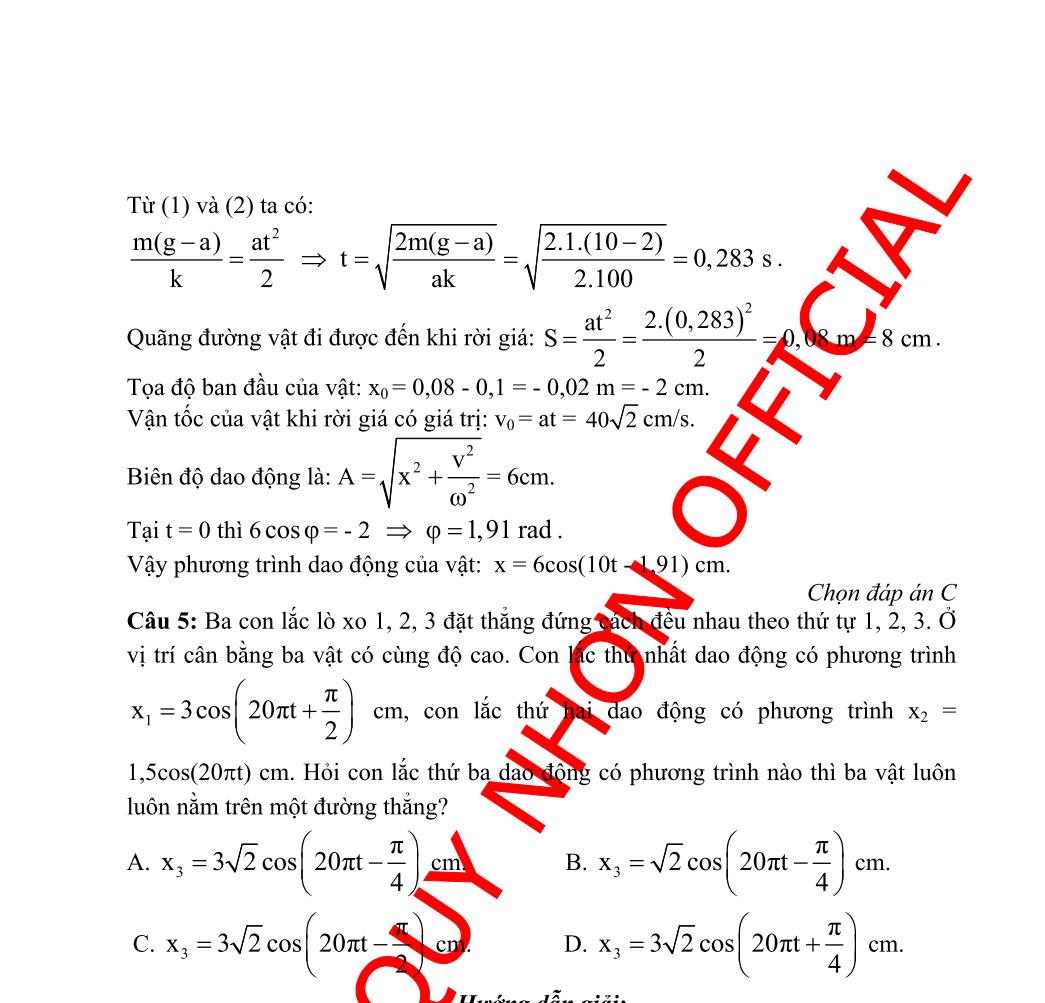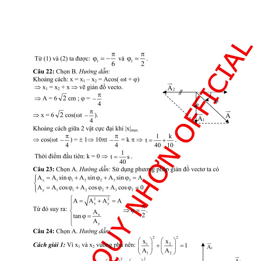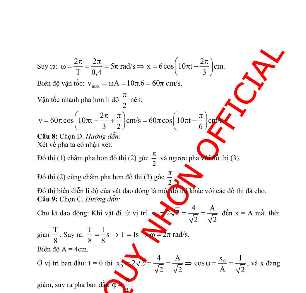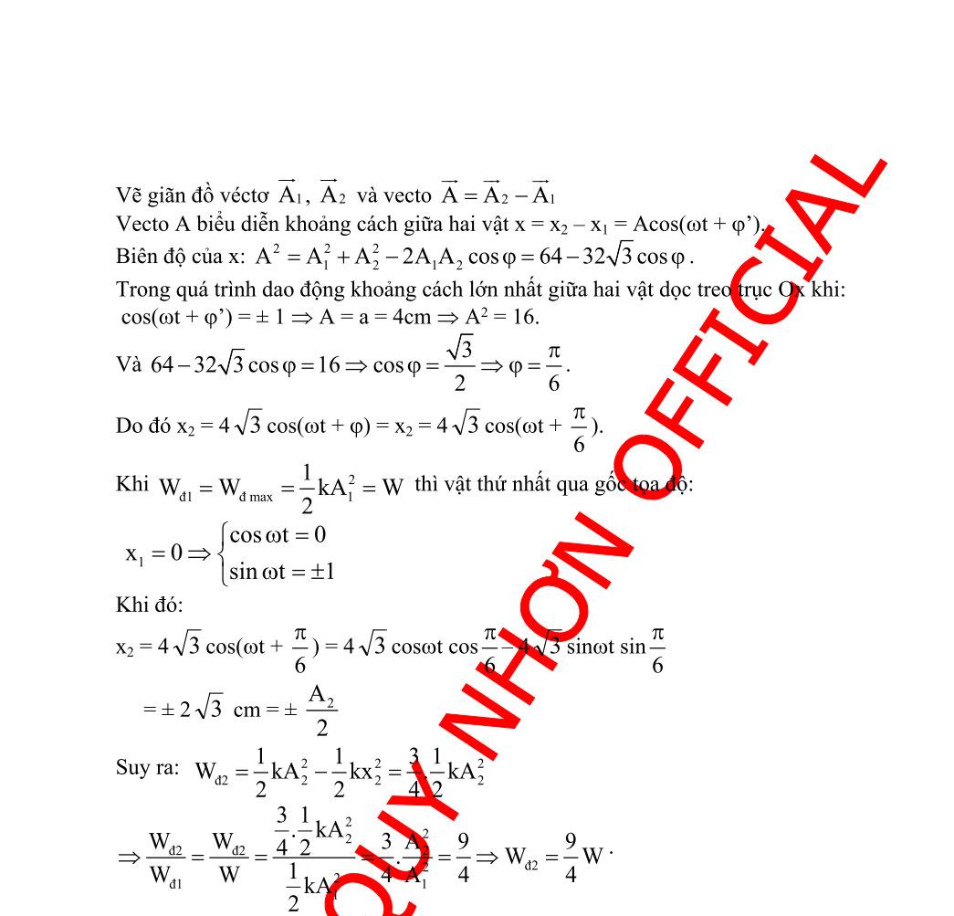 DẠYKÈMQUYNHƠN OFFICIAL Trang 16 x=5=20cos(10t+ ) cos(10t+ )=0,25=cos(±0,42).π 2 π 2 Vìv=–100sin(10t+ )<0nênta chọn (10t+ )=0,42 +2k π 2 π 2 Suyra t=–0,008+0,2k; với k Z. Nghiệm dương nhỏ nhất trong họ nghiệm này