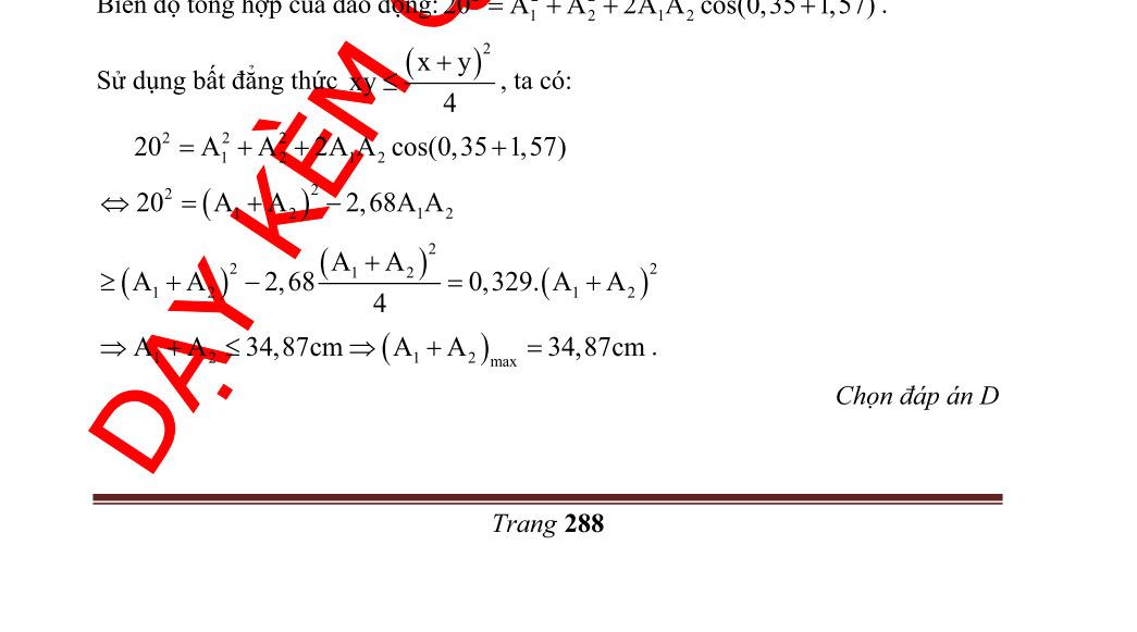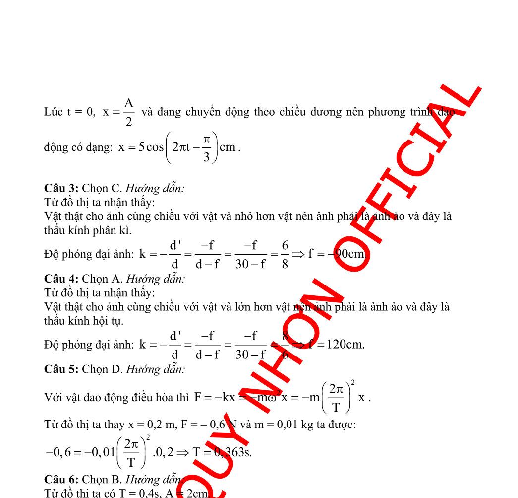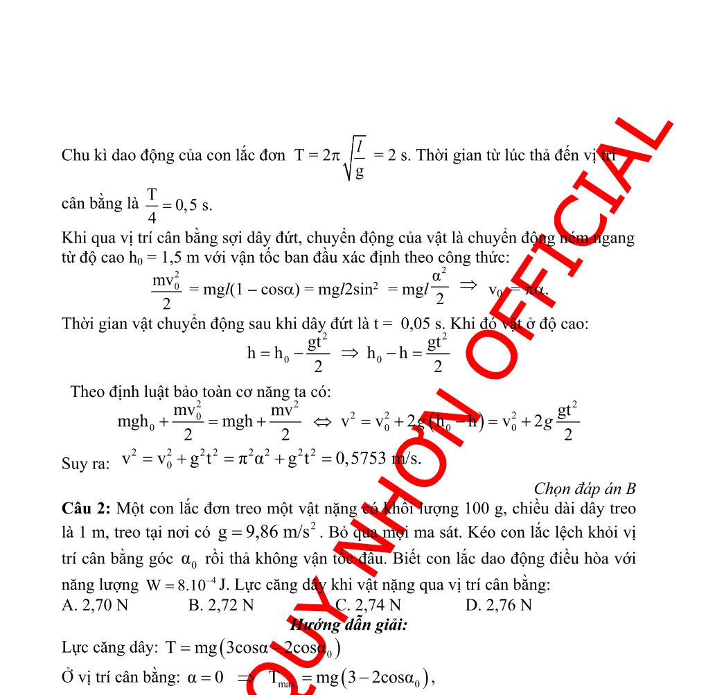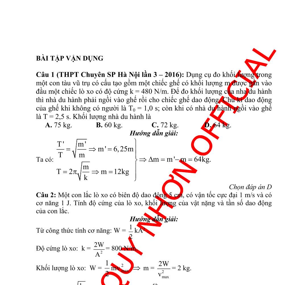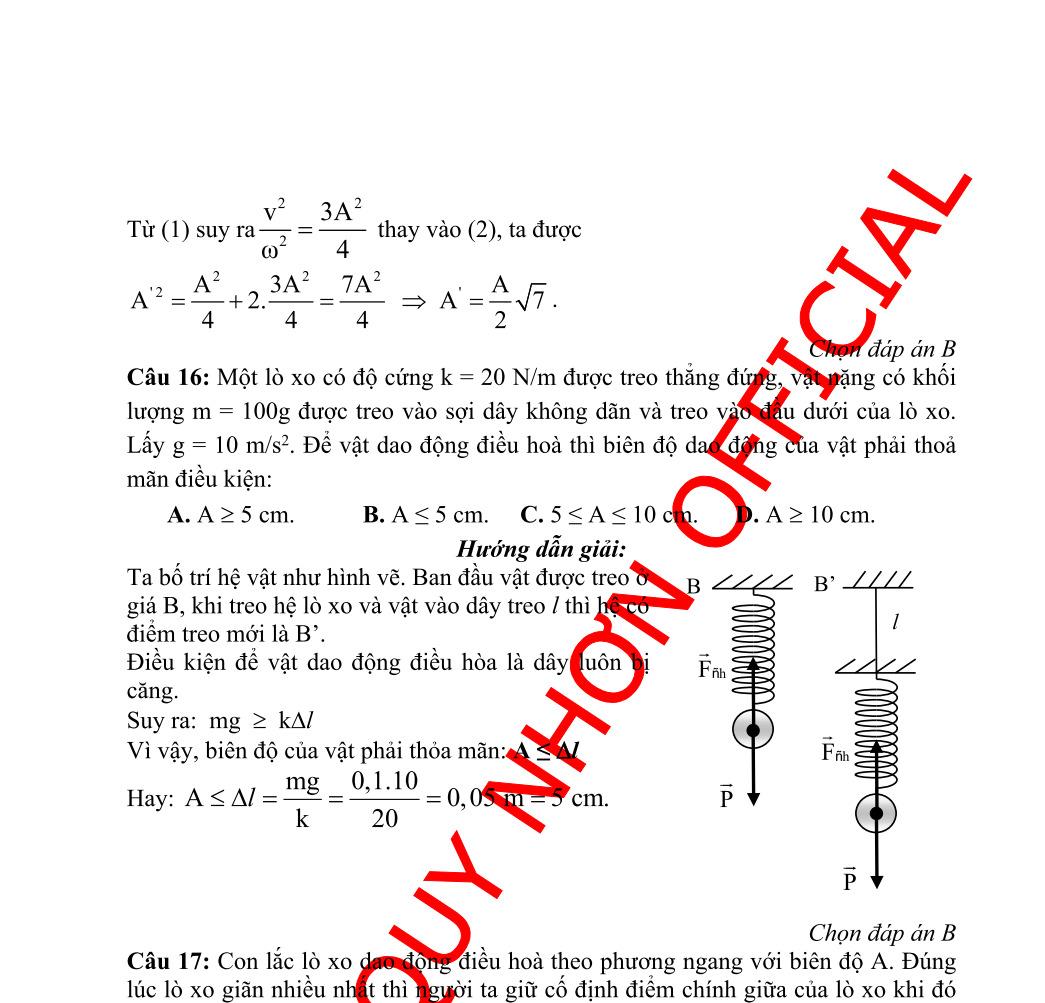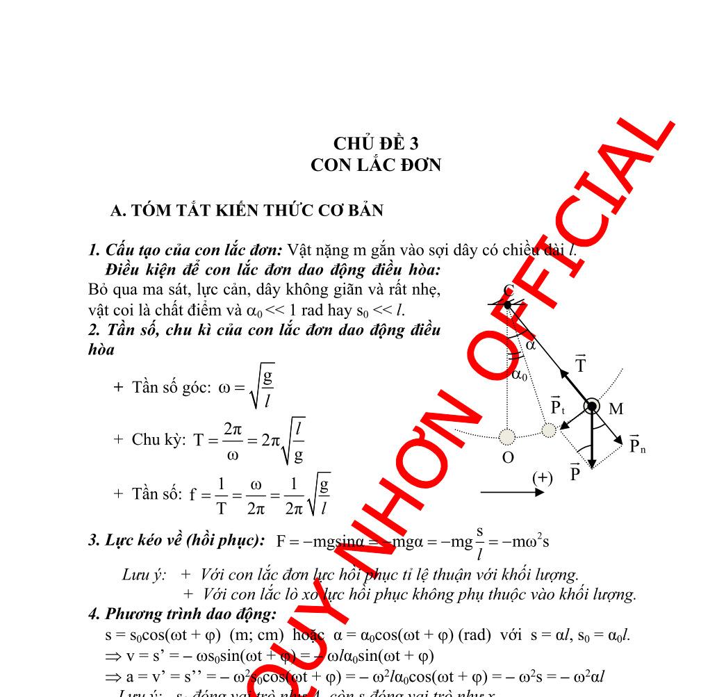 DẠYKÈMQUYNHƠN OFFICIAL Trang 16 x=5=20cos(10t+ ) cos(10t+ )=0,25=cos(±0,42).π 2 π 2 Vìv=–100sin(10t+ )<0nênta chọn (10t+ )=0,42 +2k π 2 π 2 Suyra t=–0,008+0,2k; với k Z. Nghiệm dương nhỏ nhất trong họ nghiệm này