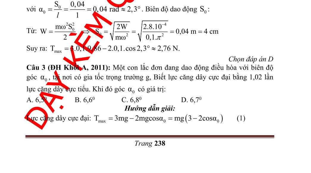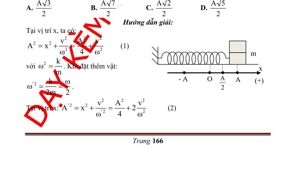 đó A=6cm. Từ t0 =0 đến t1: t1 =1,5s+0,25s=T+ . T 6 Vì vậy khi chất điểm ở M0, chất điểm CĐ theo chiều âm, đến vị tríbiênâm,trongt = đi được quãng đường T 6 A 2 Do vậy tọa độ chất điểm ơt thời điểm t=0làx0 =– =–3cm. A 2 Câu 87: Chọn D. Hướng dẫn: Vật dao động hòaquanh vị tríx=1cm Tacó: . Δt15 T 5t2,5T2T T22 2 Ở thời điểm t=0 1 xcm 2 v0 Trong2chukì vật qua vị tríx=1cm được 4 lần( mỗi chukìqua2 lần) Trong nửa chukì tiếp theo vật quax=1cmthêm1 lần nữa. Câu 88: Chọn B. Hướng dẫn: Cách giải 1: Wđ =Wt 222 2221 1 2mAsin(2t)mAcos(2t) 323 22 cos(4t)04tk 332 M0 M2M1 O