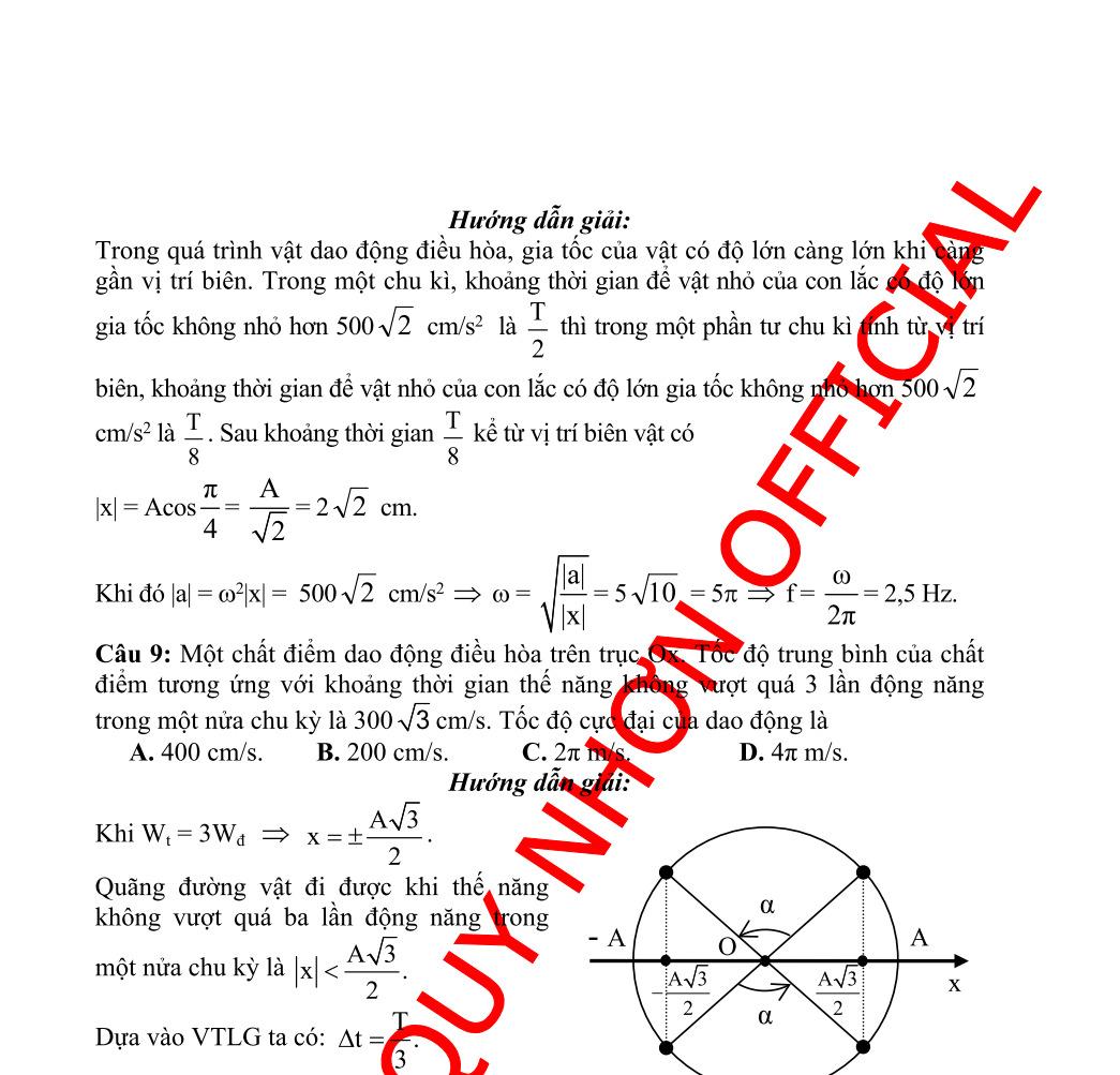 DẠYKÈMQUYNHƠN OFFICIAL Trang 150 Tacó: 12 11 2 max 2 2 max A3 xAx 2 v0xA v vA3 vxA1 2 v2 TTTT t4t. 46123 Câu 100: Chọn D. Hướng dẫn: Tacó: 12 1A 1 xAx 2 max 2 2 v0xA TTTT vt4t. A vx 4882 22 Câu 101: Chọn B. Hướng dẫn: Tacó: 12 1A max1 xAx 2 m2 ax 2 2 aaxA TTT2T at4t. a1A4263 Ax 222 Câu 102: Chọn D. Hướng dẫn: -A +AO 0,5A30,5A3 T/12 T/12 T/12 T/12 +A-A OA 2 A 2 T/8 T/8 T/8 T/8 -A O +A -A/2 +A/2 T/6 T/6 T/6 T/6
