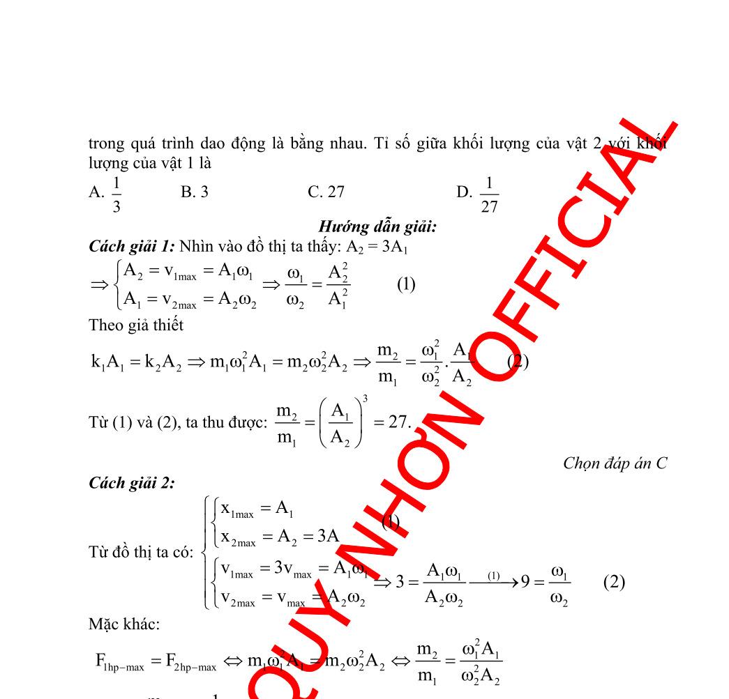 DẠYKÈMQUYNHƠN OFFICIAL Trang 148 Thời điểm a=15 m/s2 = x=± .Doa>0vậtchuyển độngnhanhdầnvềmax a 2 A 2 VTCBnênvậtởđiểmMứngvớithờiđiểm t= =0,15s (Góc ). 3T 4 0 MOM 2 Câu 91: Chọn C. Hướng dẫn: Tại t 0:x0 A,v0 0:Trên đường tròn ứng với vị tríM. Tại t:x : Trên đường tròn ứng với vị tríN. A 2 Vật đi ngược chiều + quay được góc Δφ 1200 . Tại t T = . 2 3 2 2 T 32 T 3 Câu 92: Chọn B. Hướng dẫn: Tiến hànhtheocác bước tacó: Vật dao động điều hòa từ x1 đến x2 theo chiều dương tương ứng vật CĐTĐ từ M đến N. Trong thời giant vật quay được góc Δφ 1200 2 3 Vậy : t T = 2 2 T 3.2 T11 s 34.312 Câu 93: Chọn B. Hướng dẫn: Theo giả thuyết, cứ sau khoảng thời gian ngắn nhất nhất định thì vật lại cóli độ cách vị trícân bằng như cũ.t Khi đó: (1). Nếu ta chọn x1 có dạng (2) 12 12 t2t2t T tt 4 1 2 1 1 xAcost xAsint Từ (1)tacó: ,thayvào(2)suyra: .12 T tt 8 1 A2 x 2 Câu 94: Chọn A. Hướng dẫn: Bấm máytính: = 0,0357571s.1 1 1x3,5 1 tarcsinarcsin A1010 Câu 95: Chọn C. Hướng dẫn: Bấm máytính: 1 1 t1x2t2.0,1 arccosT 0,51s Ax1,2309 arccos A x OA A 0x x M N x 1 2 O AA1x 2x M N