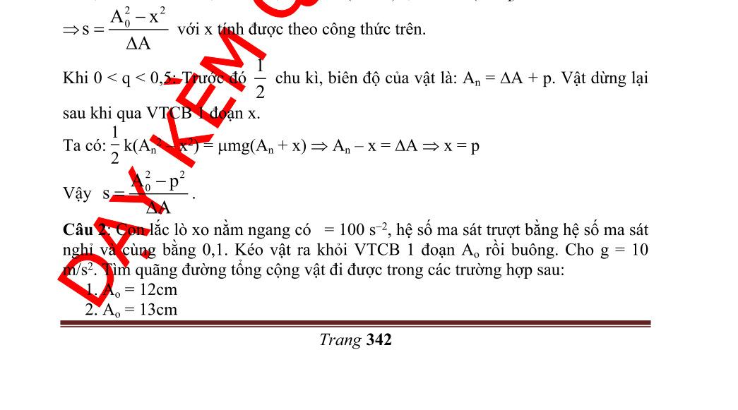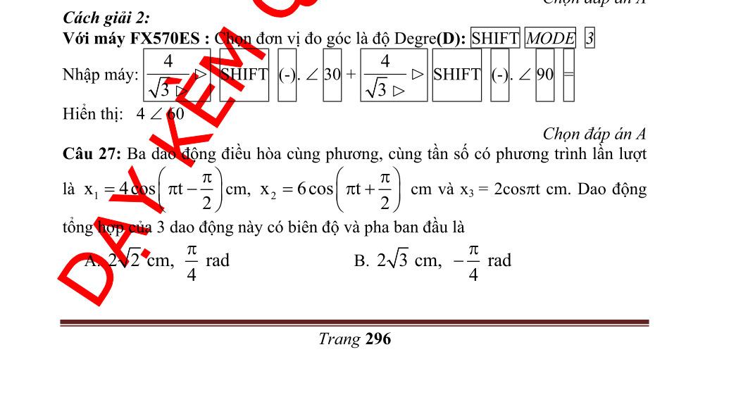 DẠYKÈMQUYNHƠN OFFICIAL Trang 151 Tacó: 12 1A max1 xAx 2 m2 ax 2 2 aaxA TTTT at4t. 1A aAx 4882 222 Câu 103: Chọn A. Hướng dẫn: Cách giải 1: Chu kỳ .Do đó thời gian đi được là0,25s bằng 1 nửa 2 T0,5s chu kỳ nên quãng đường tương ứng là 2A. Quãng đường S = 2A = 2.4 = 8 cm (một nửa chu kỳ: m=1). Cách giải 2: Từ phương trìnhli độ, tacó phương trình vận tốc : v16sin4tcm/s. 3 Quãng đường vật đi được trong khoảng thời gian đã cholà: 2 1 t0,25 t0 Sds16sin4tdt. 3 Với máytínhFx570ES: Bấm: SHIFT MODE 1 Bấm: SHIFT MODE 4 Bấm ,bấm: SHIFT hypDùnghàm trị tuyệt đối (Abs).Với biểu thức trong dấu tíchphânlà phương trình vận tốc, cận trênlà thời gian cuối, cận dưới là thời gian đầu,.biến tlàx,ta được : Bấm = chờ khálâu...mànhình hiển thị: 8=>Quãng 0,25 0 16sin4tdx 3 đường S=8cm. Câu 104: Chọn C. Hướng dẫn: Vận tốc v4sin2tcm/s. 2 Chukìdao động . Số bánchukì: (chỉ 2 T1s 2,875 m5,755 1 2 lấy phần nguyên). Quãng đường trong5bánchu kỳ: ' 1 S2mA2.5.220cm. Quãng đường vật đi được trong t’: . 1 ' 2mT2 t 2 Stt