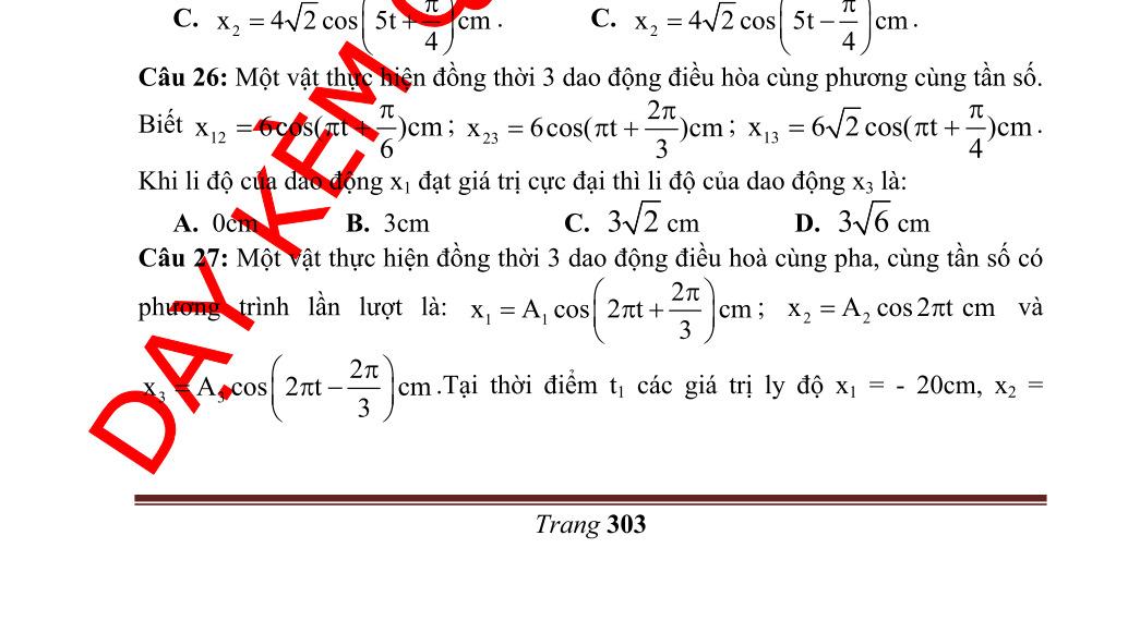 DẠYKÈMQUYNHƠN OFFICIAL Trang 23 Không làm mất tính tổng quát có thể xem ở thời điểm t1 vật có li độ x0 và đang tăng, đến thời điểm t2 vật cóli độ x0 và đang giảm, đến thời điểm t3 vật cóli độ –x0 và đang giảm. Theobàira: 31 32 T tt2t2t 4 tt2t 3132 tt3(tt) T 2T t2t3.2tt 4 12 Thay vàx0 =6cmvàocông thức T t 12 0 2 2T xAsint6AsinA12cm T T12 Chọn đáp án A Nhận xét: Các đại lượng li độ, vận tốc, gia tốc, động lượng và lực kéo về biến thiên điều hòa cùng tần số. Đối với dạng bài toán cho hệ thức liên hệ giữa t1, t2, t3 với