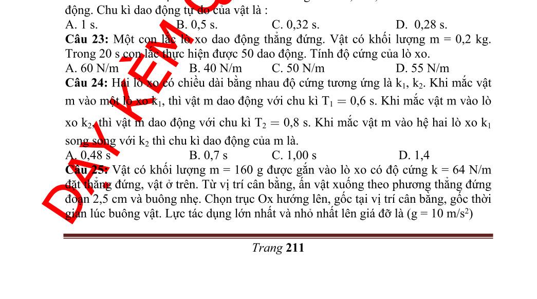 Câu 25: Chọn B. Hướng dẫn: Trong dao động điều hoà gia tốc cực tiểu của vật bằng không khi chuyển động qua VTCB. Gia tốc có giá trị âm, khi đó dấu âm chỉ thể hiện chiều của gia tốc ngược với chiều trục toạ độ.
