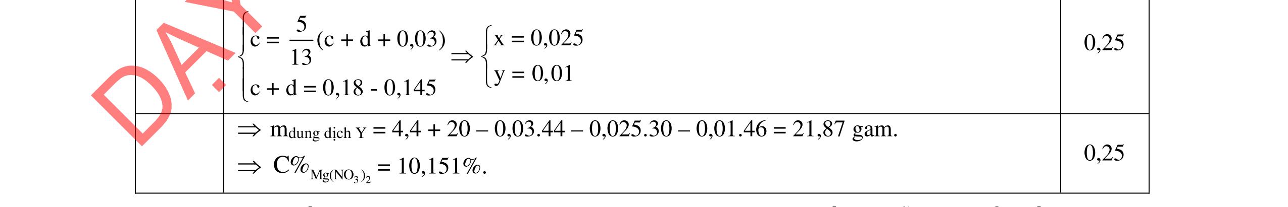 0,25 Nghiệm thỏa mãn là n=3 và M = 56 (Fe). 0,25 x= nFeS = 0,05 mol m dd Fe(NO3)3 = , +0,0556 = 29 gam Sau khi làm lạnh: m dd Fe(NO3)3 = 29 8,08 = 20,92 gam