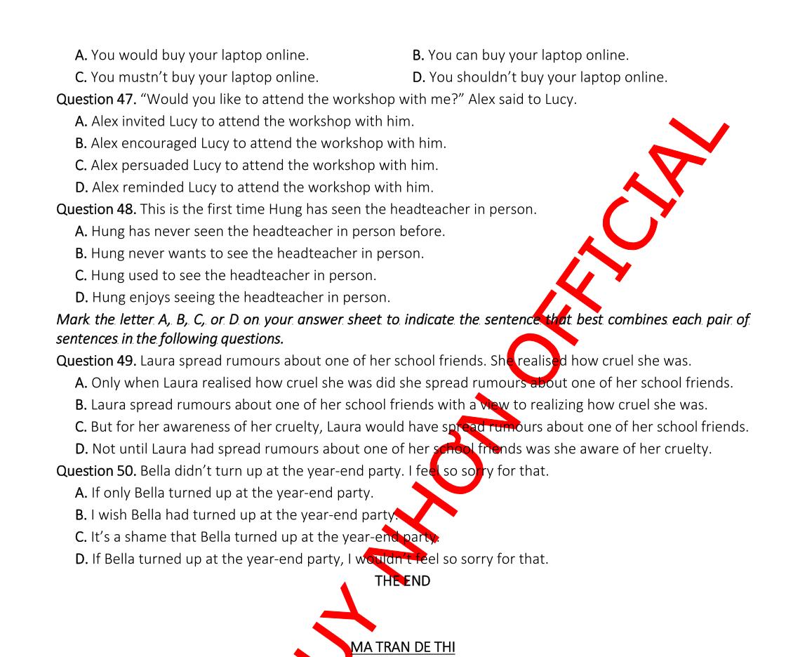 C. Same to you! D. Here you are. Question 25. Kate is paying a compliment on Linda’s new hat.