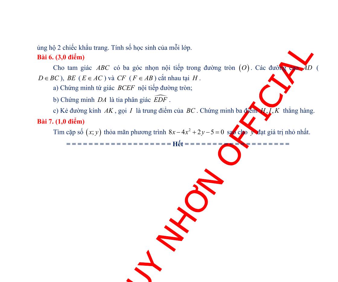 DẠYKÈMQUYNHƠNOFFICIAL 2 2 2 12 4 5 HC 2 144 16 25 HC 2256 25 HC 16(cm) 5 HC Vitamgiác vuông tại nên . AHC H 2 1 1121696 .. cm 2 25525 AHC SAHHC Câu 6. (2, 0 điểm) Chotamgiác nhọn nội tiếp đường tròntâm ; là điểm () ABCABAC OE chính giữa cung nhỏ .BC a) Chứng minh . CAEBCE Vì là điểm chính giữa của cung nhỏ nên . E BCsdcsdcBECE