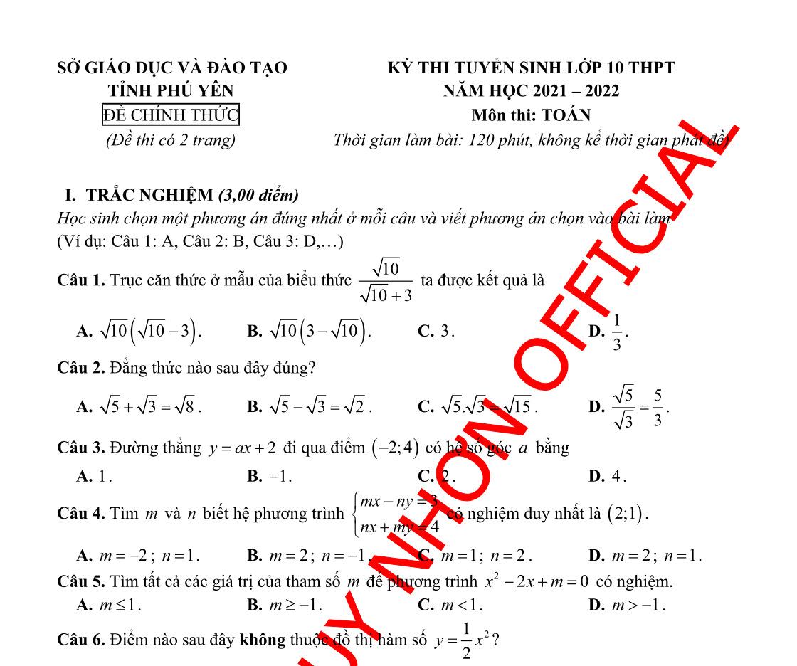 TUYỂN SINH LỚP 10 THPT NĂM HỌC 2021-2022 Môn thi: TOÁN Thời gianlàmbài:120phút (không tính thời gian phát đề)