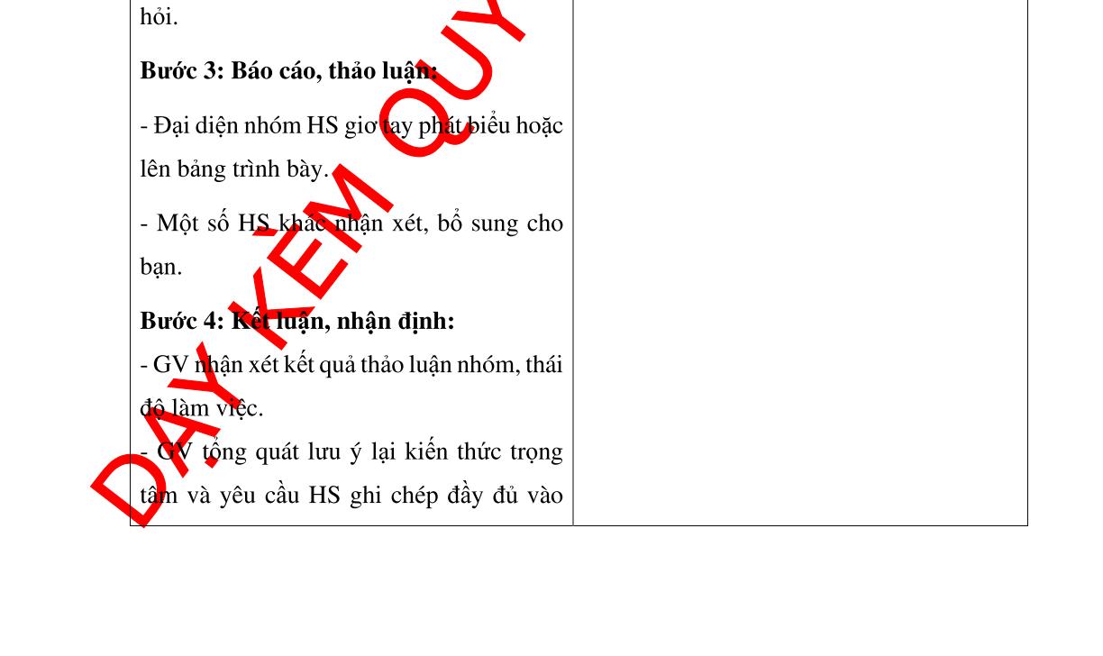 Bước 4: Kết luận, nhận định: - GV nhận xét kết quả thảo luận nhóm, phần thuyết trình thái độ làm việc. - GV tổng quát lưu ý lại kiến thức trọng tâm và yêu cầu HS ghi chép đầy đủ vào vở
