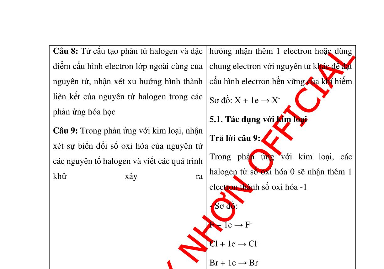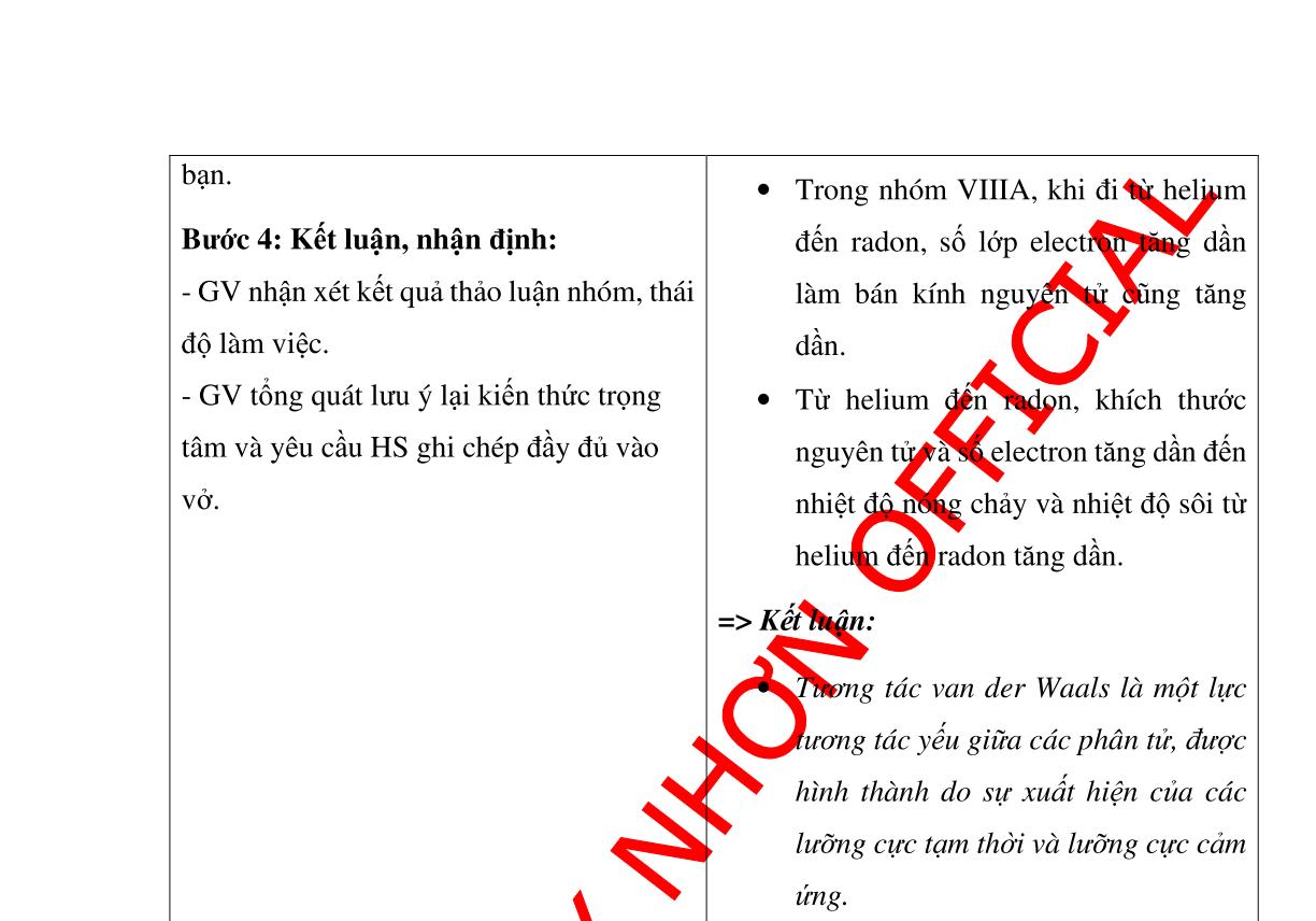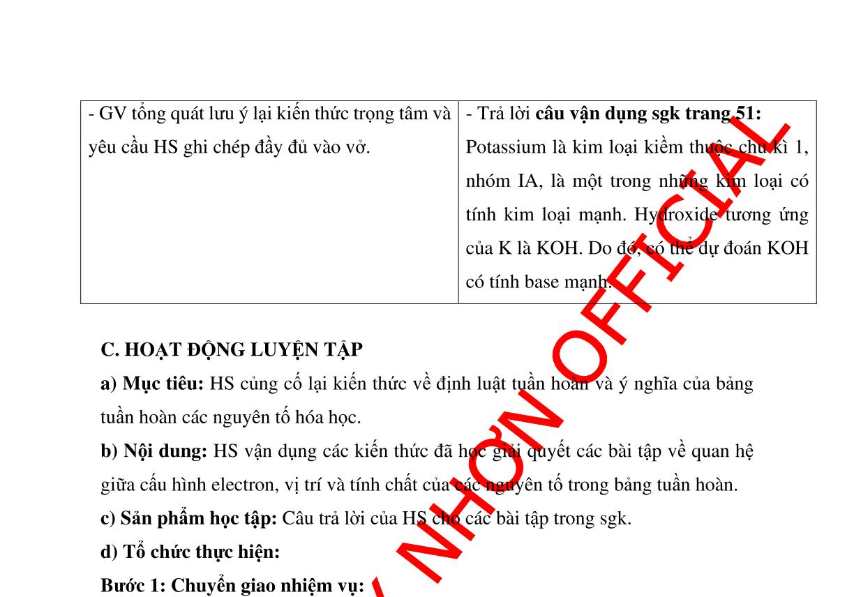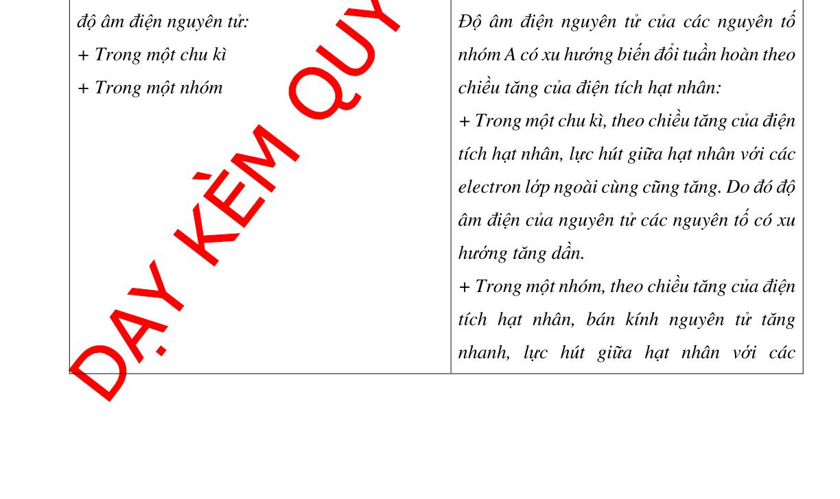 • Vận dụng kiến thức kĩ năng đã học: Giải thích được xu hướng biến đổi bán kính nguyên tử trong một chu kì, trong một nhóm (nhóm A) (dựa theo lực hút tĩnh điện của hạt nhân với electron ngoài cùng và dựa theo số lớp electron tăng trong một nhóm theo chiều từ trên xuống dưới); Nhân xét và giải thích được xu hướng biến đổi độ âm điện và tính kim loại, phi kim của nguyên tử các nguyên tố trong một chu kì, trong một nhóm ( nhóm A); Nhận xét được xu hướng biến đổi thành phần và tính chất acid / base của các oxide và các hydroxide theo chu kì, viết được phương trình hóa học minh họa.
