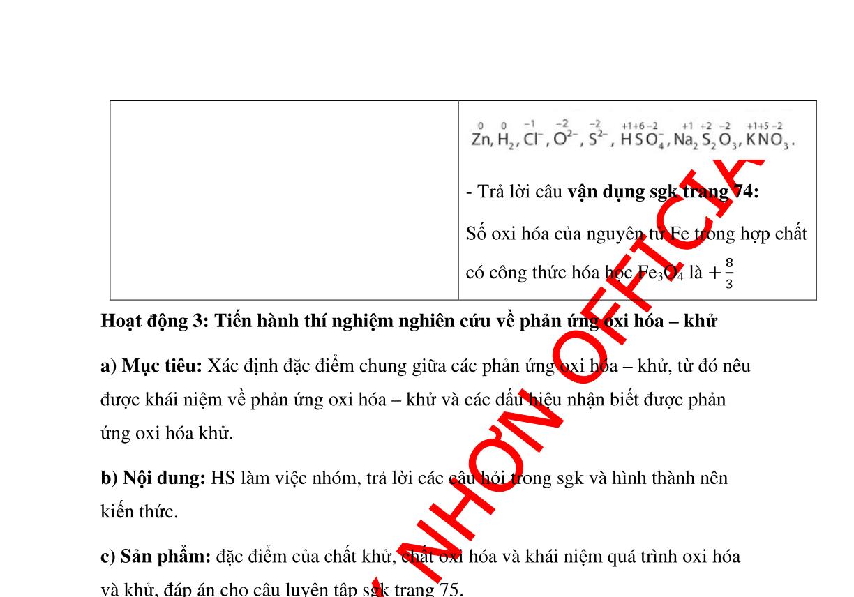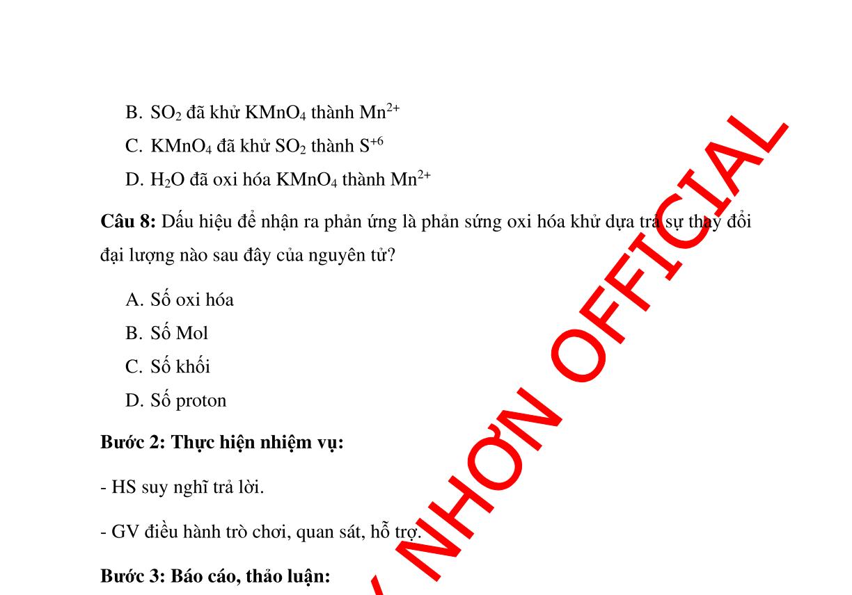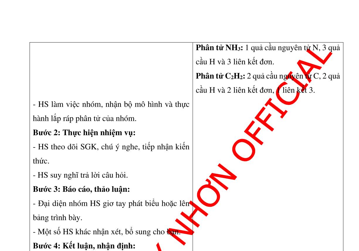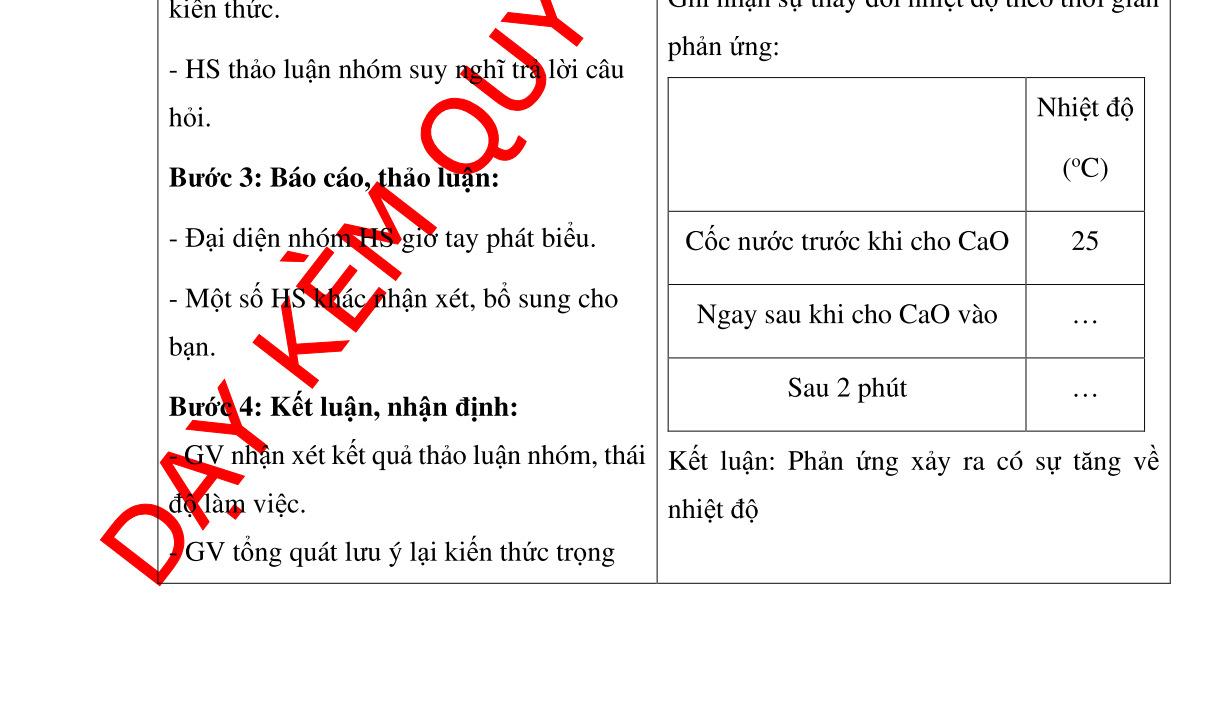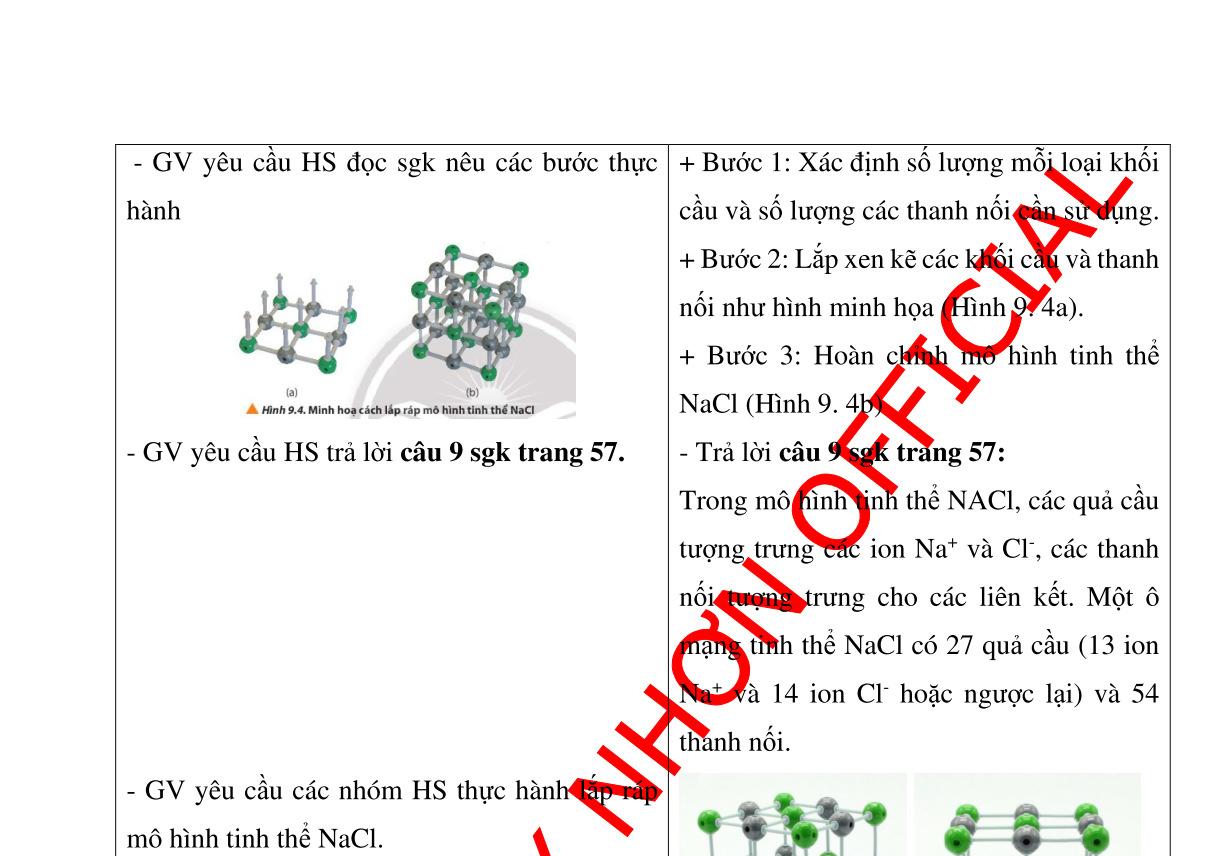 - GV nhận xét kết quả thảo luận nhóm, phần thuyết trình thái độ làm việc. - GV tổng quát lưu ý lại kiến thức trọng tâm và yêu cầu HS ghi chép đầy đủ vào vở. HS thảo luận nhóm đôi và nhóm 4 thực hiện yêu cầu của GV để tìm hiểu kiến thức bài học. c) Sản phẩm: Đáp án câu 8, 9 sgk trang 10; kết luận về phương pháp nghiên cứu hóa học, đáp án bài tập vận dụng sgk trang 10. d) Tổ chức thực hiện: