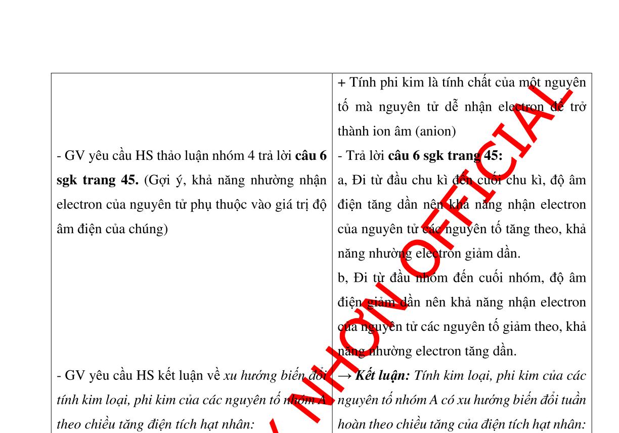 • Nhận xét và giải thích được xu hướng biến đổi độ âm điện và tính kim loại, phi kim của nguyên tử các nguyên tố trong một chu kì, trong một nhóm (nhóm A)