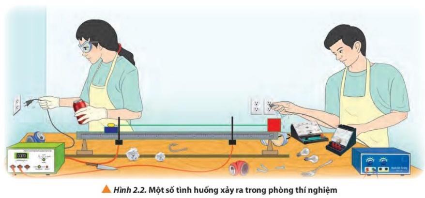 Nhiệm vụ 2. Tìm hiểu vấn đề an toàn trong phòng thí nghiệm. Bước 1. GV chuyển giao nhiệm vụ học tập - GV: “Trong vật lí, việc tiến hành học đi đôi với thực hành là cực kỳ quan trọng, nhằm kiểm chứng kiến thức, phát triển năng lực tìm hiểu thế giới của HS. Tuy nhiên cần phải bảo đảm an toàn khi tiến hành làm thí nghiệm vì đã có nhiều sự cố xảy ra cho người làm thí nghiệm.” - GV tổ chức cho HS làm việc nhóm để trả lời các câu hỏi sau: Câu 1. Em hãy nêu một vài sự cố có thể xảy ra khi làm thực hành ở phòng thí nghiệm vật lí? Câu 2. Quan sát hình 2.2 và chỉ ra những điểm không an toàn khi làm việc trong phòng thí nghiệm.