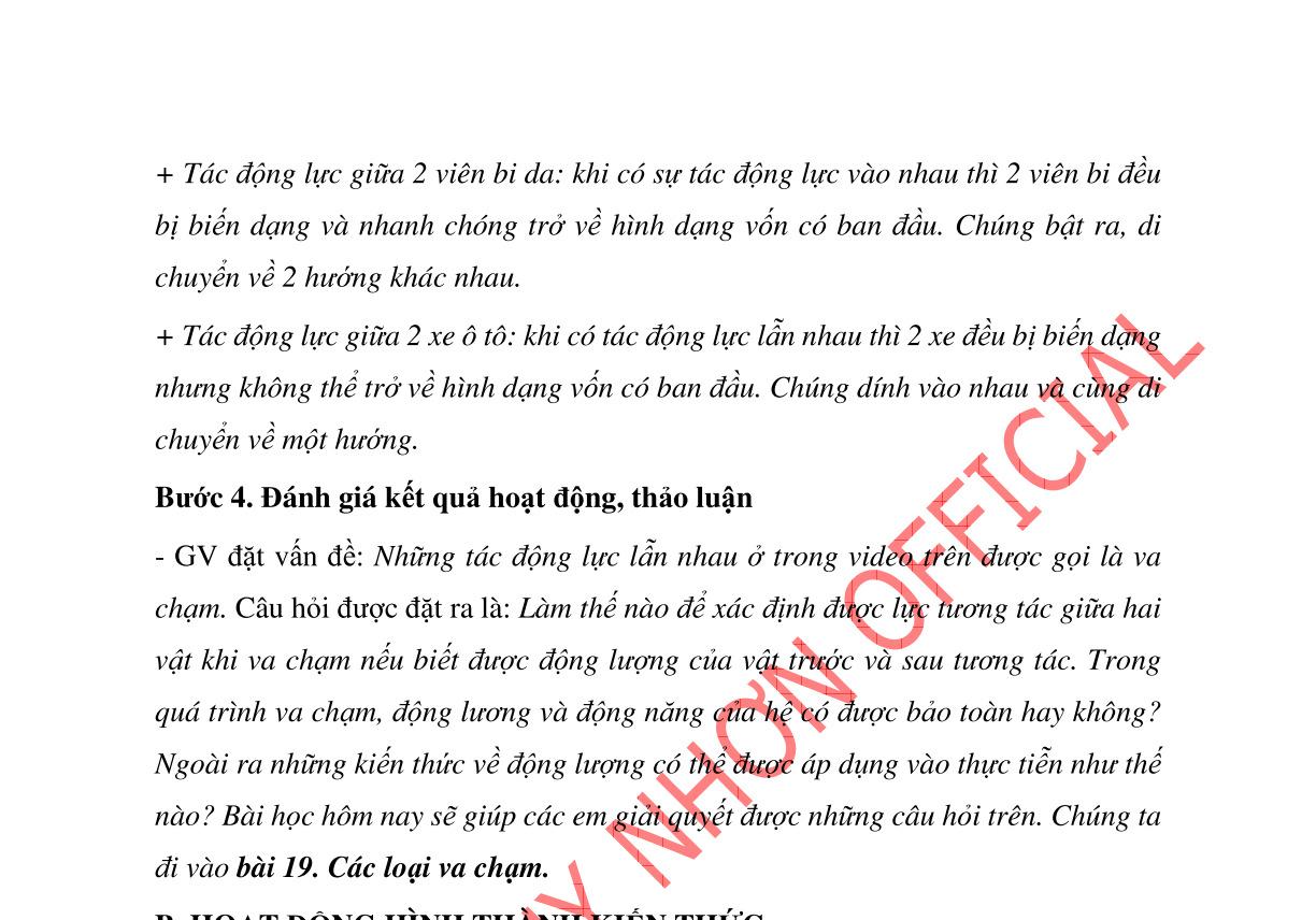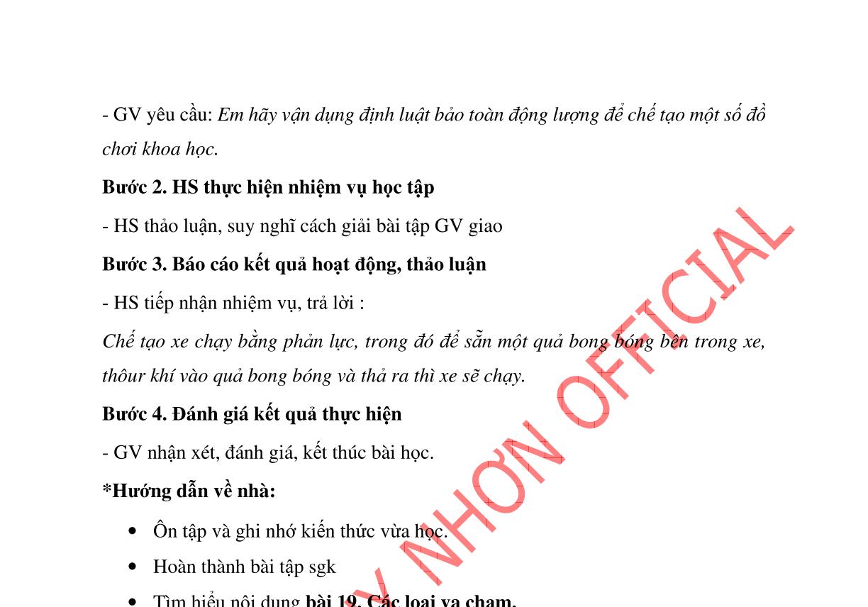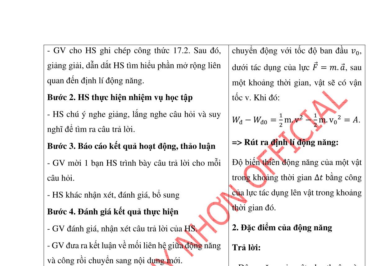 - Các HS lắng nghe và quan sát câu trả lời của bạn, để đưa ra nhận xét, góp ý bổ sung. Bước 4. Đánh giá kết quả thực hiện - GV đánh giá, nhận xét câu trả lời của HS => GV đưa ra kết luận cách xác định độ dịch chuyển trong khoảng thời gian từ đến của vật, kết luận chuẩn kiến thức rồi chuyển sang nội dung mới.
