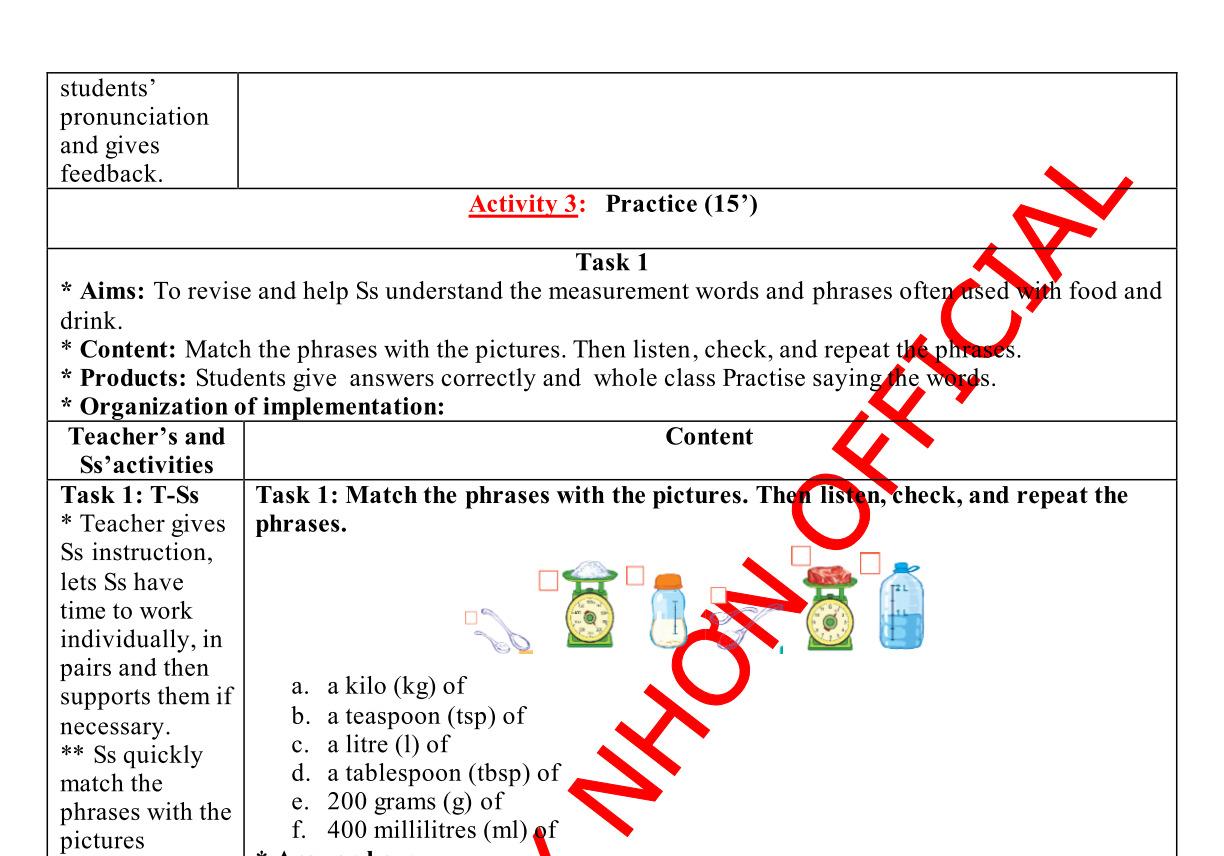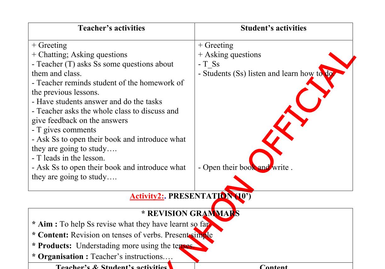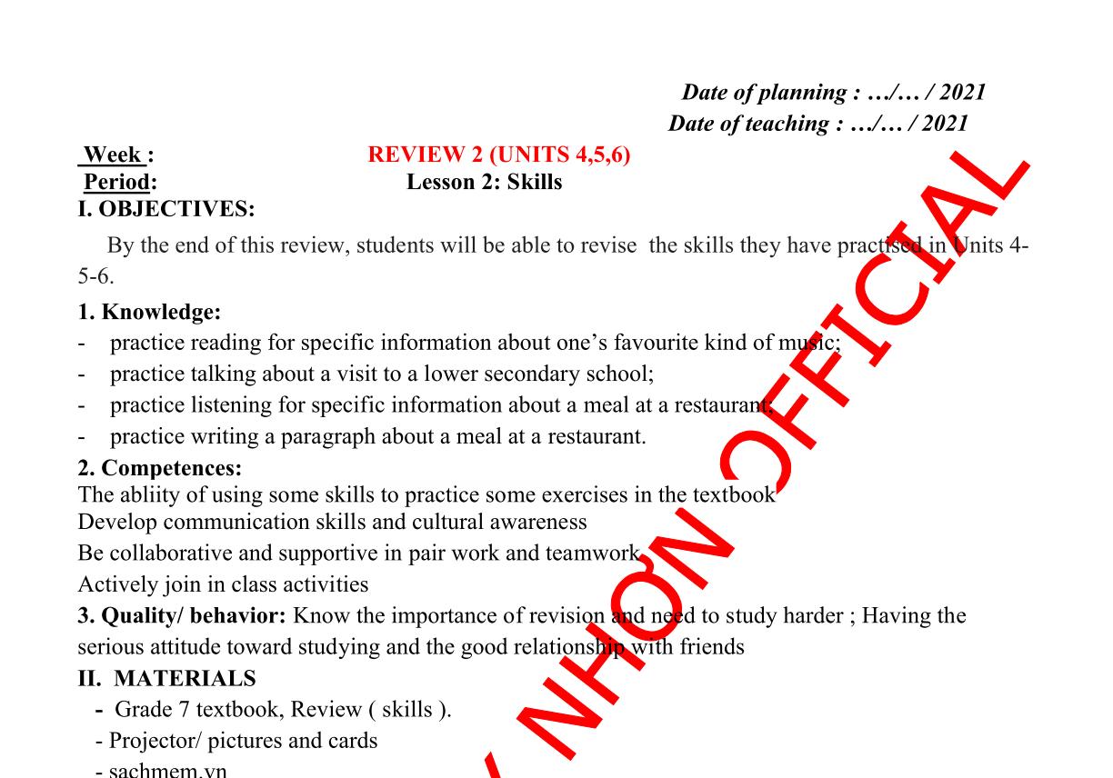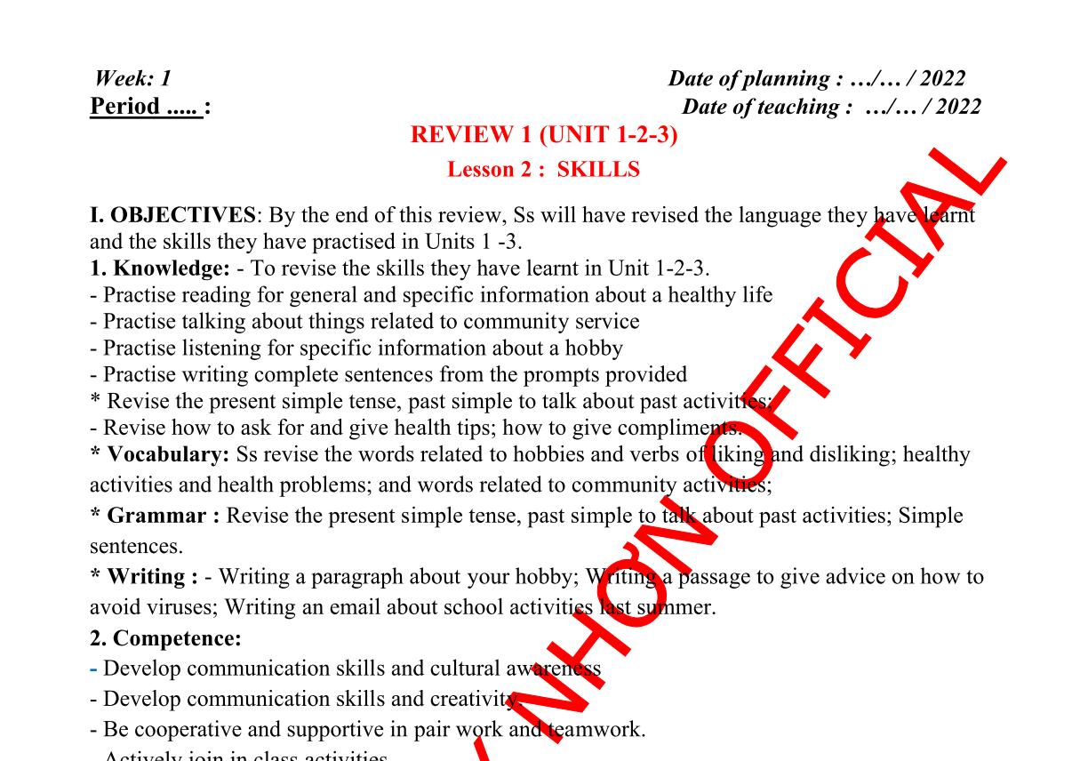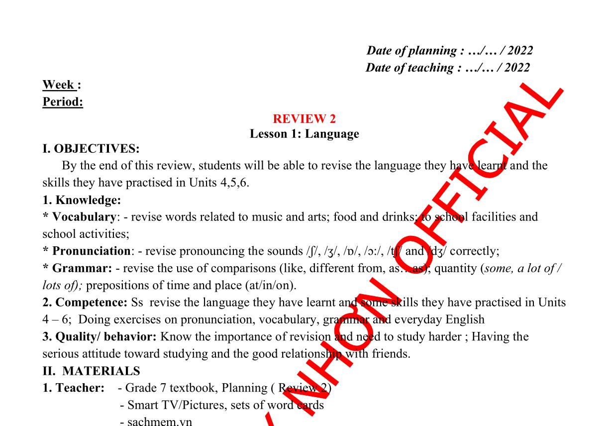 After the lesson, students will review the main contents of the lessons which are learned in the 6th form: The simple present tense, the present continuous tense, near future, present perfect, conditional sentences, modal verb wh-questions,…