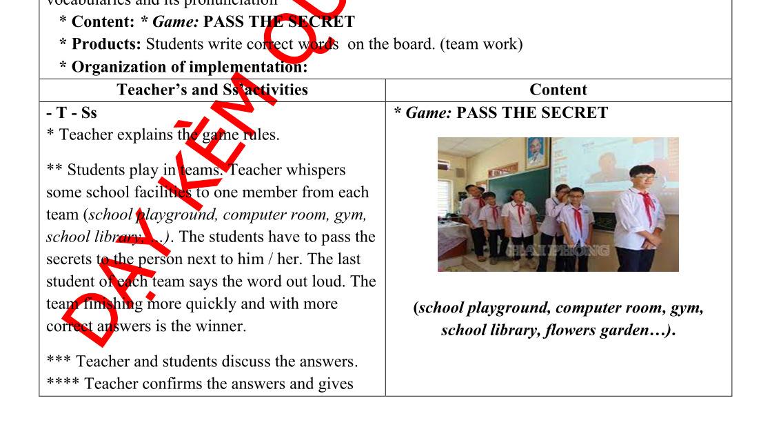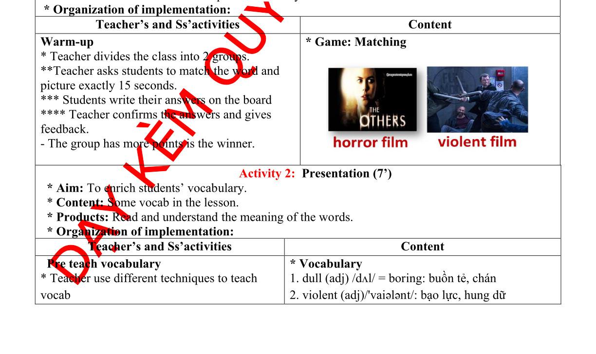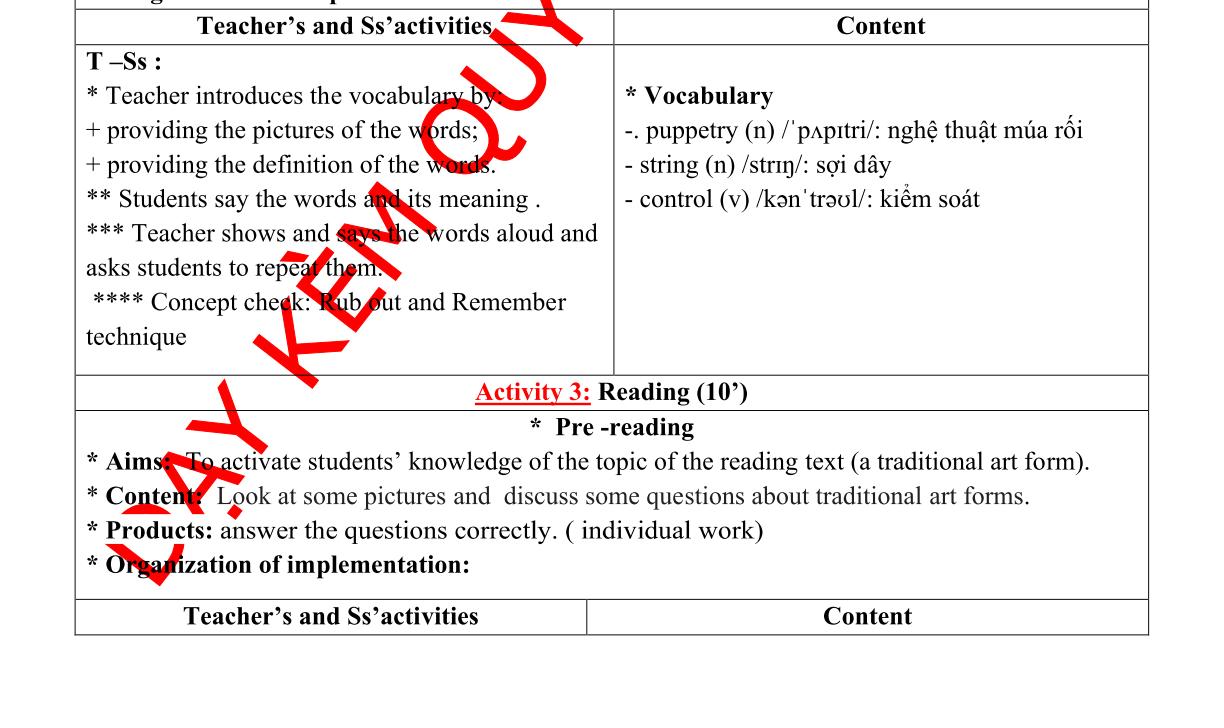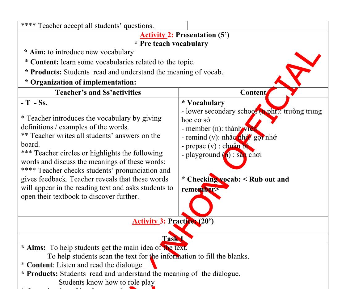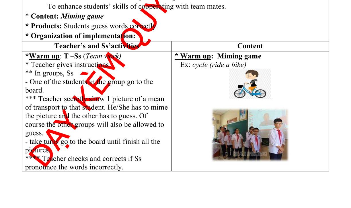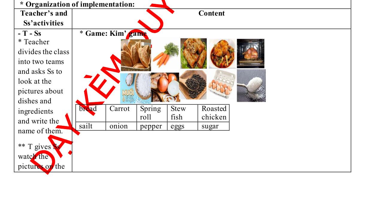 * Organization of implementation: Teacher’s and Ss’activities Content - T –Ss ; Ss –Ss