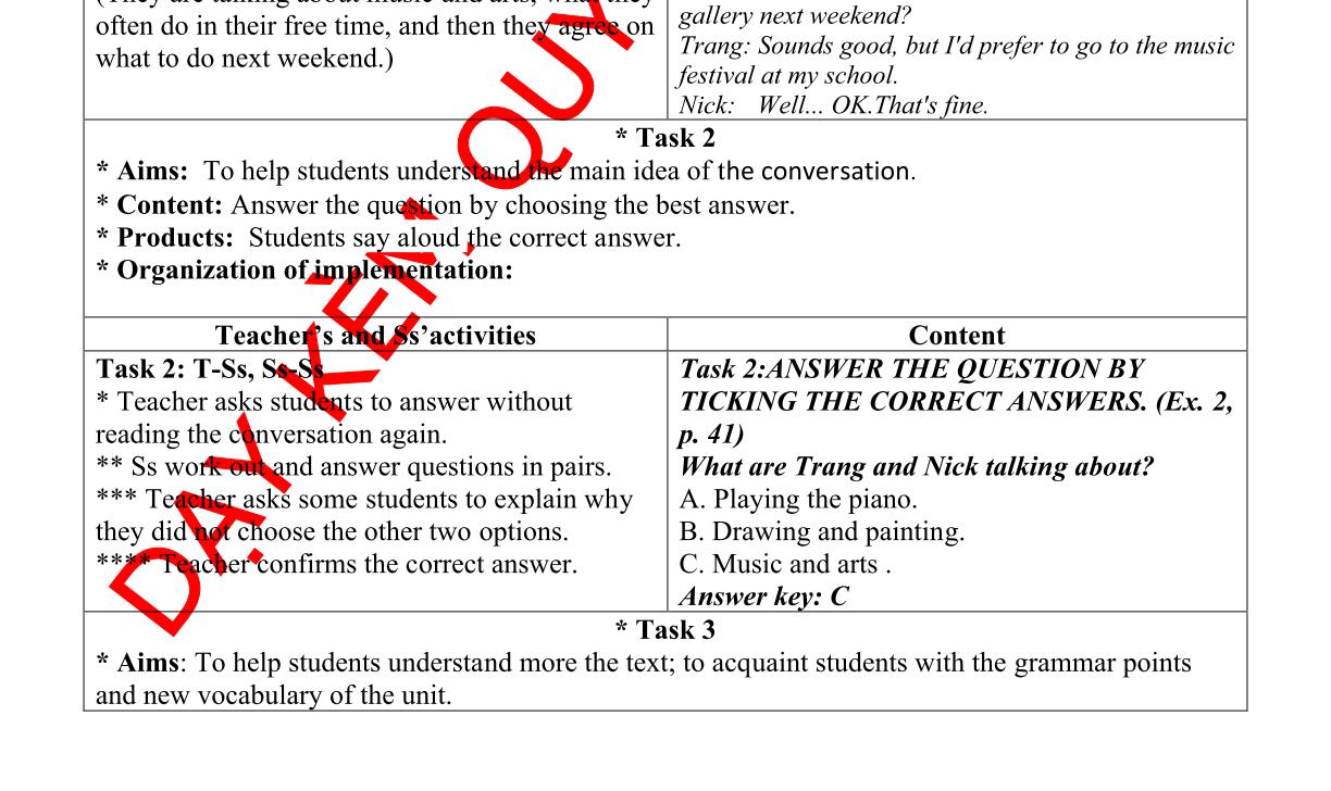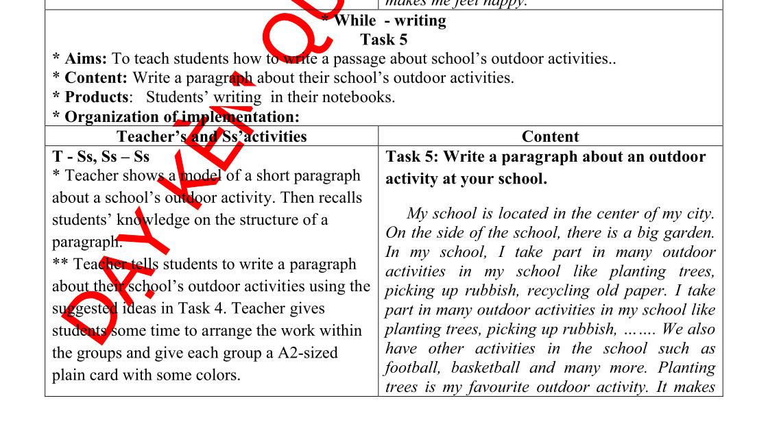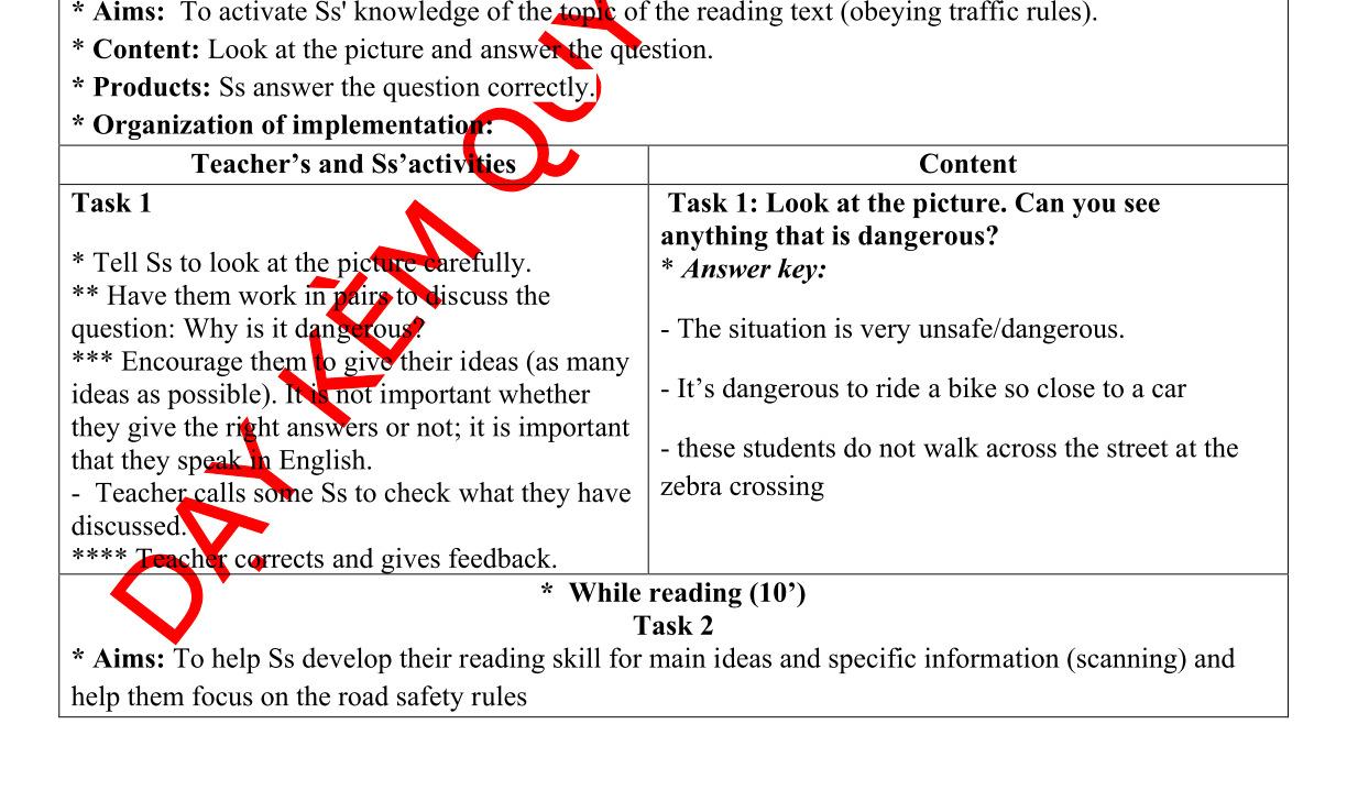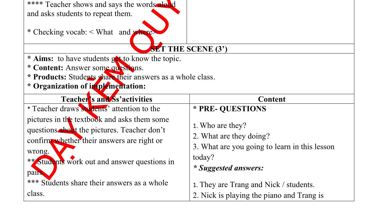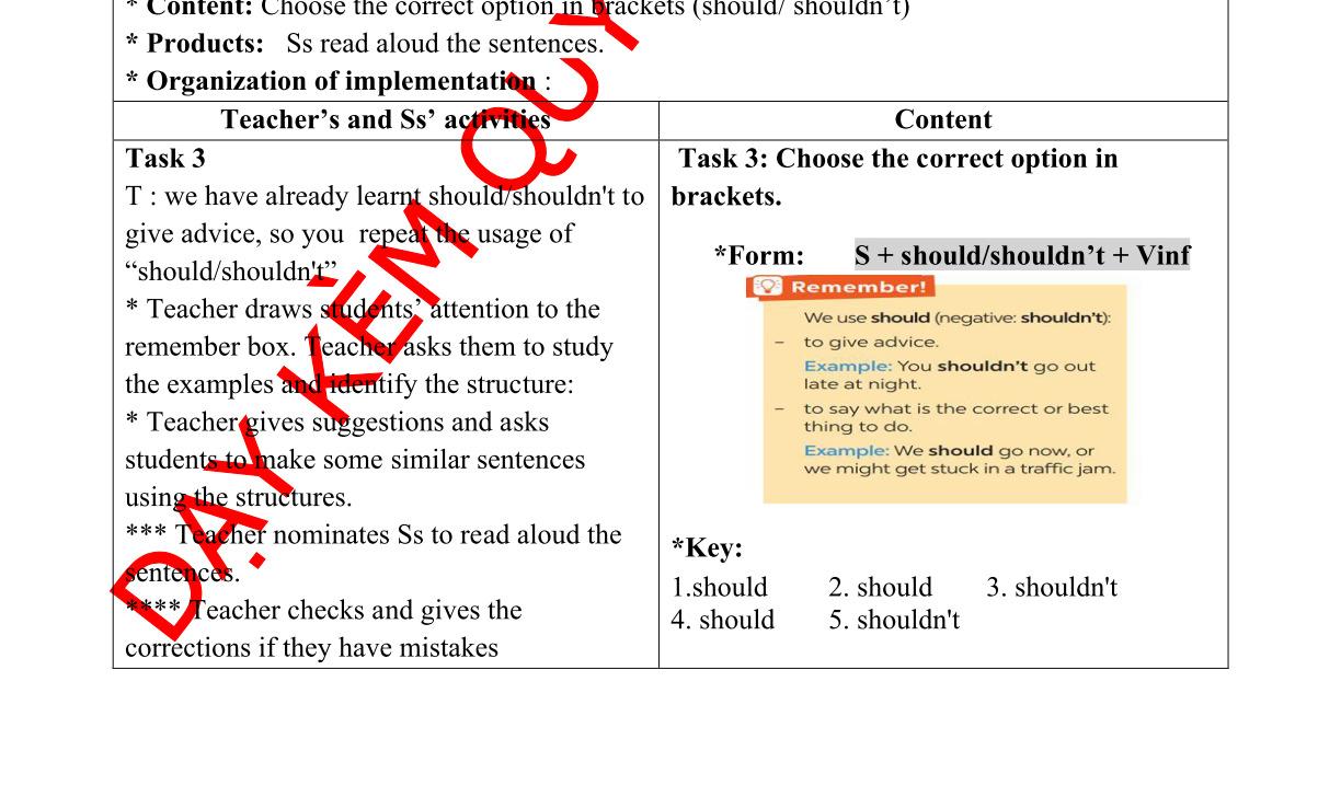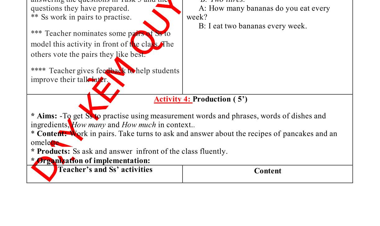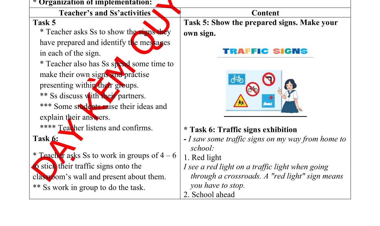 * Organization of implementation: Teacher’s and Ss’activities Content - T –Ss ; Ss –Ss
