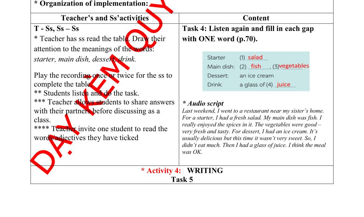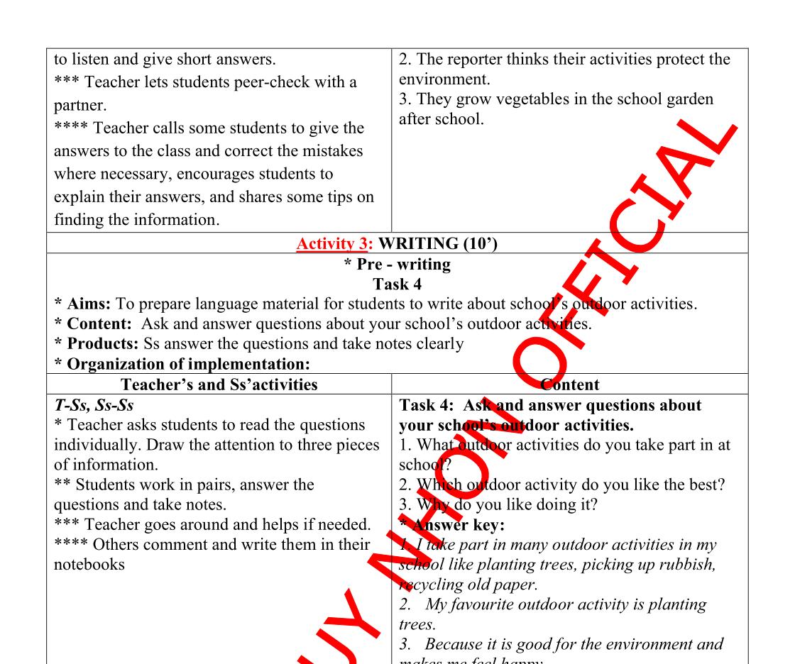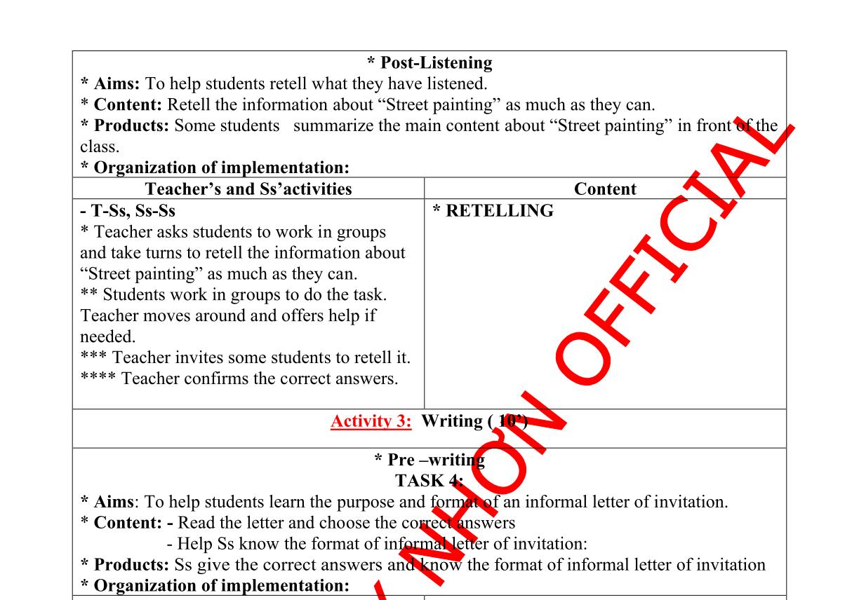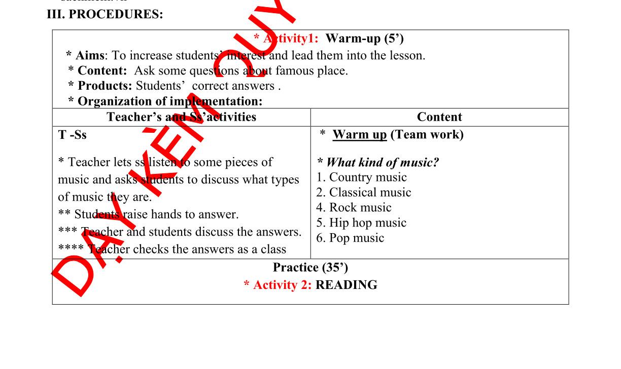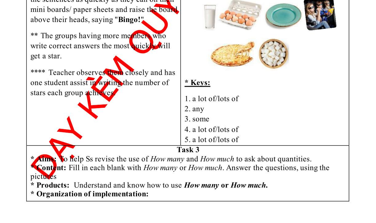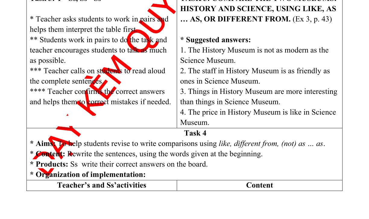* Organization of implementation: Teacher’s and Ss’activities Content - T –Ss ; Ss –Ss