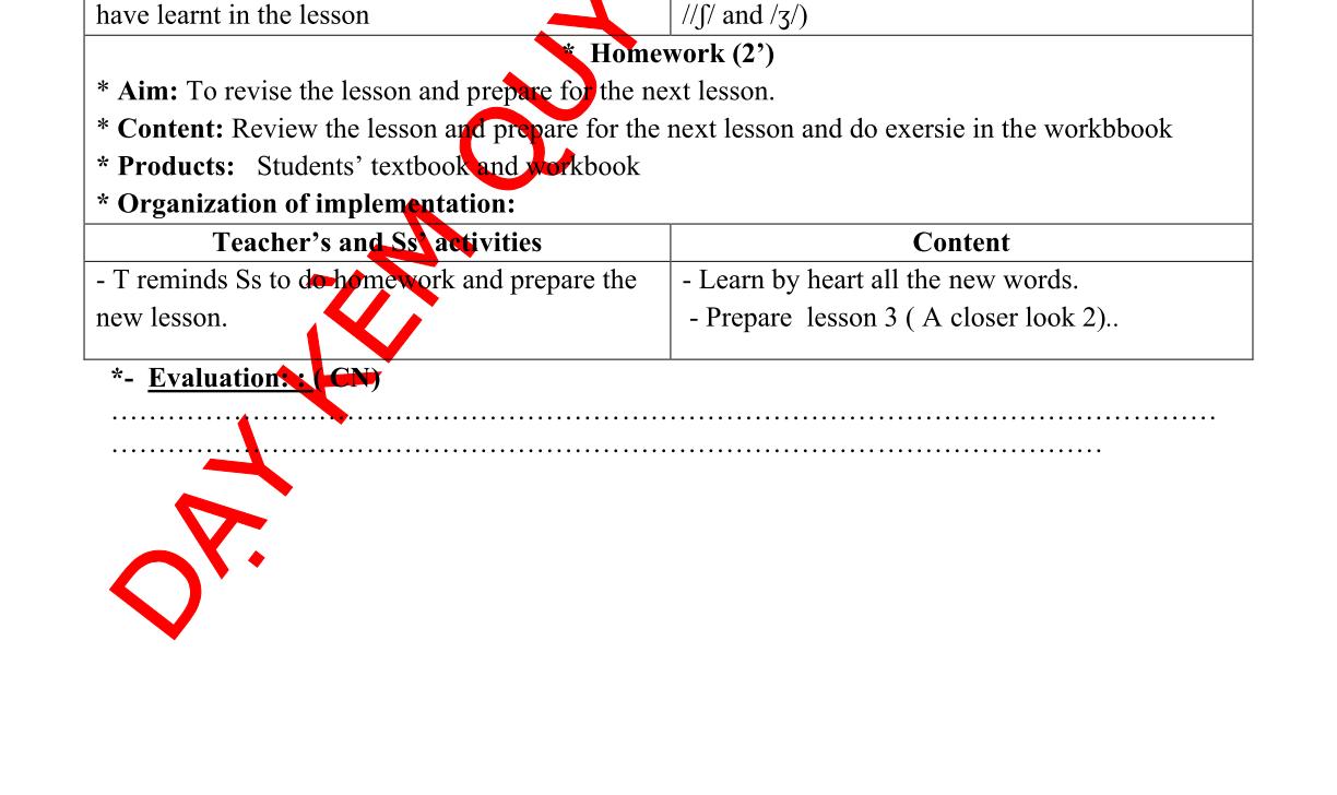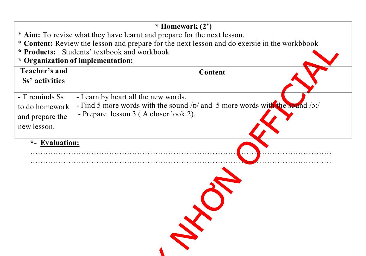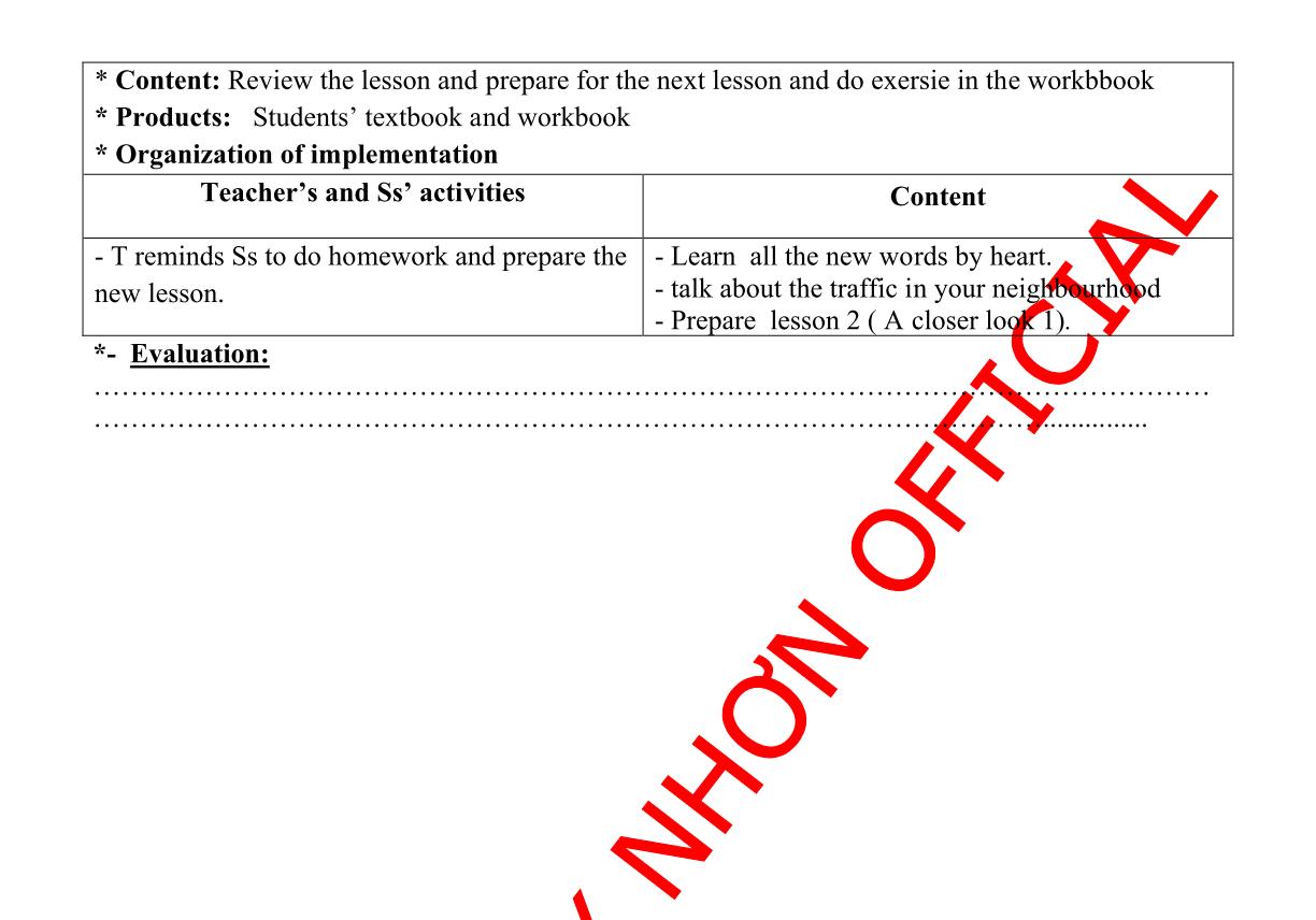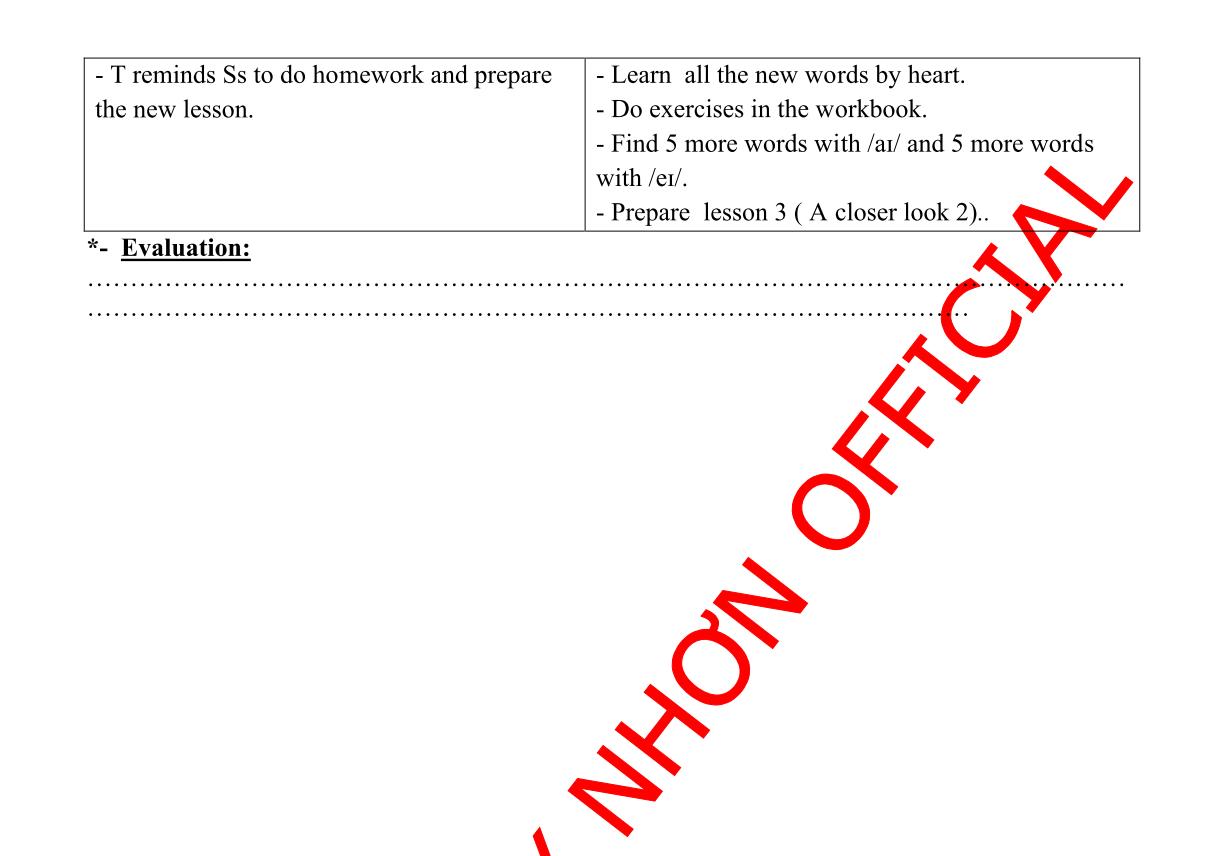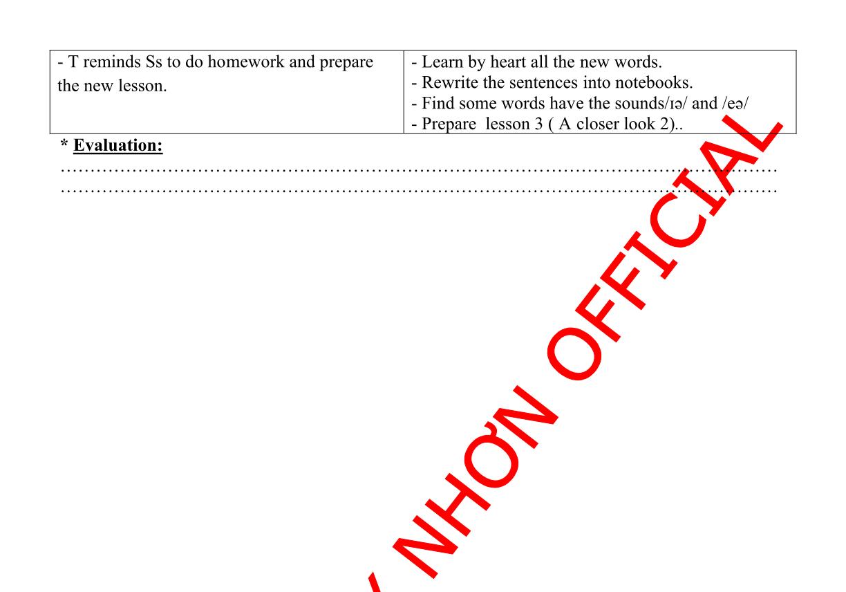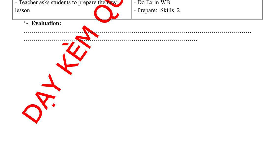 IV/ –Homework: Prepare for the next lesson: Unit 1: My hobbies < Getting started > V/ Evaluation: ………………………………………………………………………………………………………