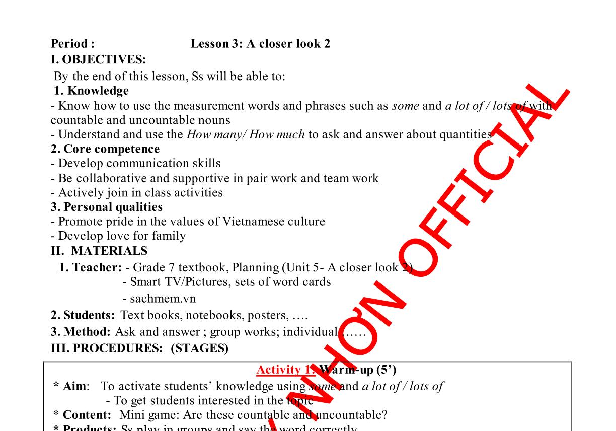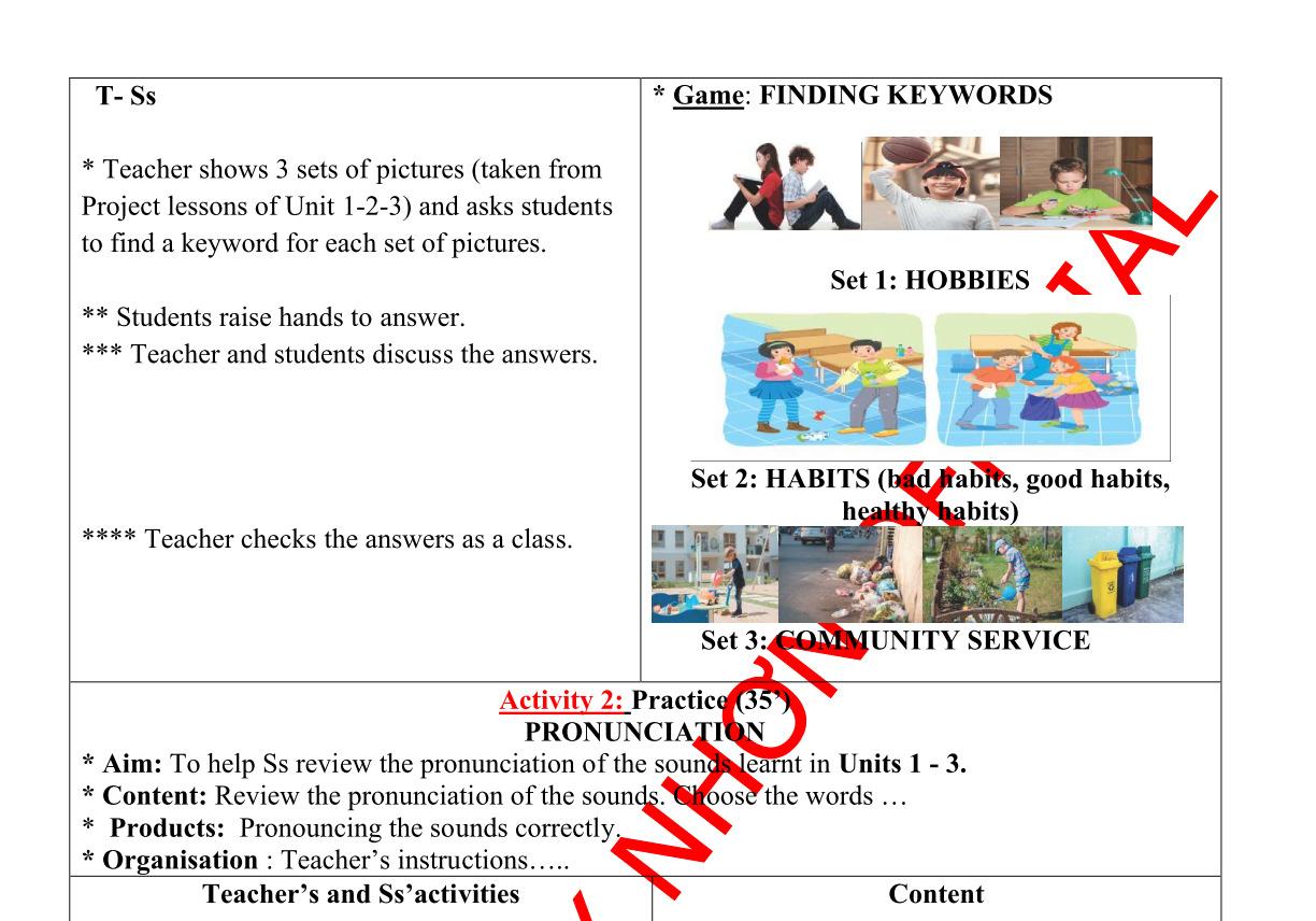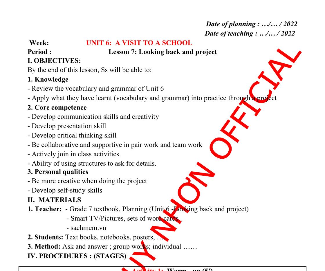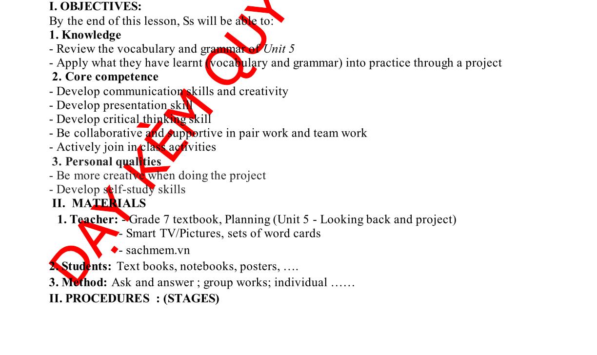 1. Teacher: -Grade 7textbook, Planning (Unit 3 -Looking back and project) -Smart TV/Pictures, sets of word cards -sachmem.vn