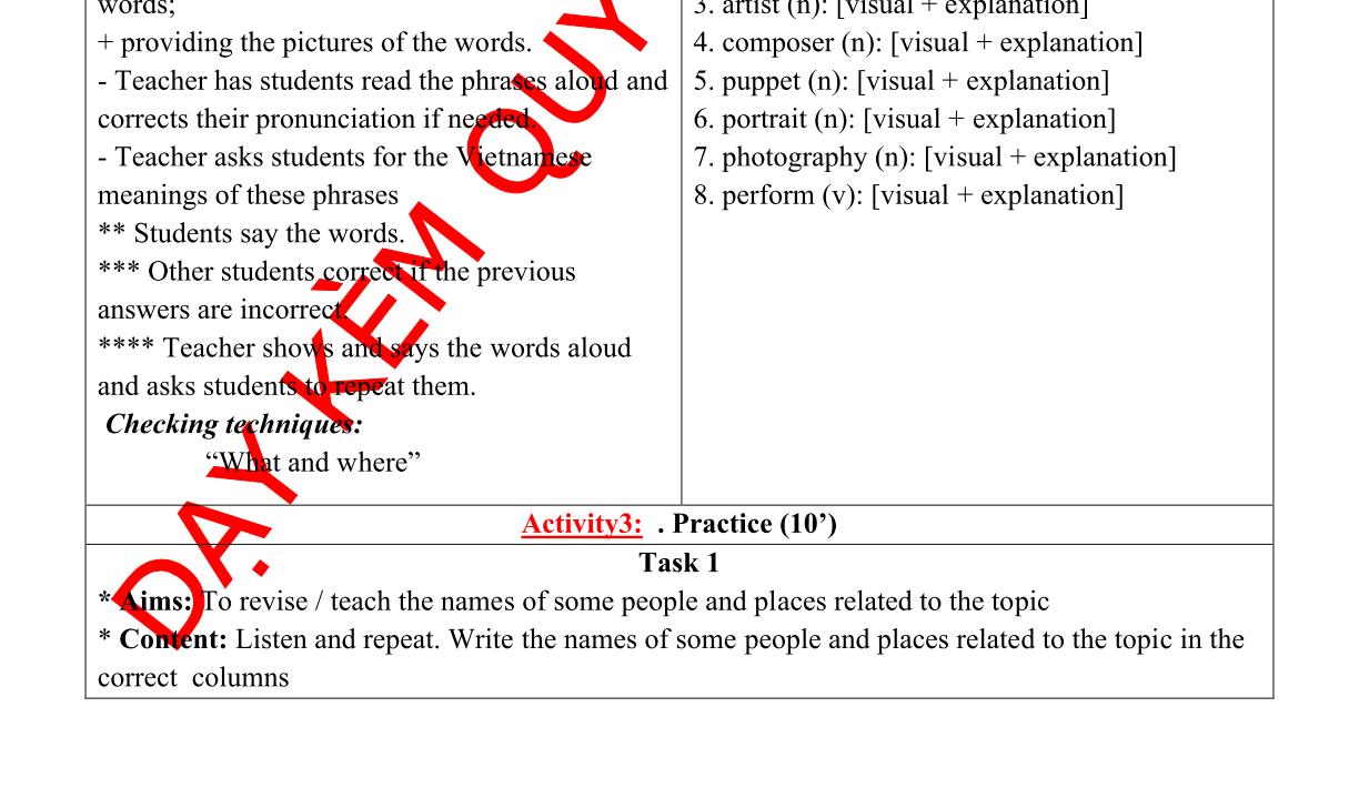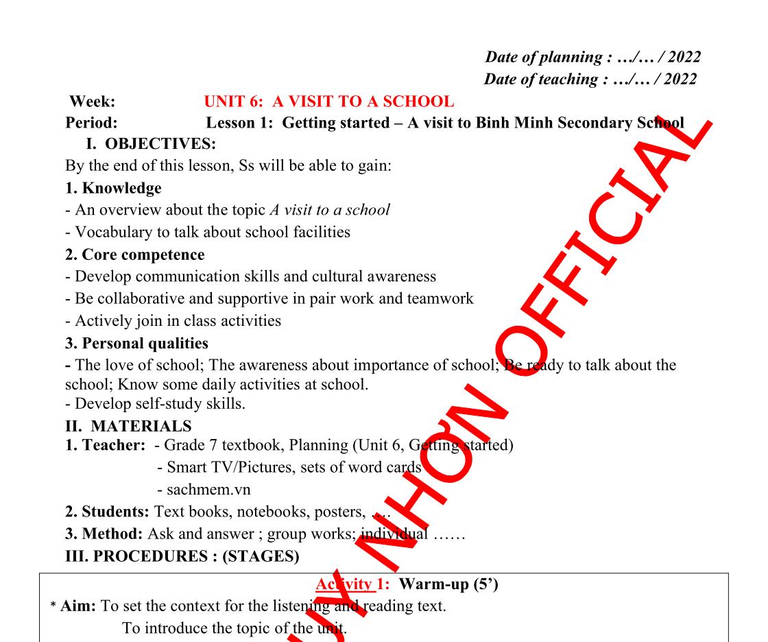 1. Teacher: -Grade 7textbook,Planning ( Unit 4-Getting started ) -Smart TV/Pictures, sets of word cards -sachmem.vn
