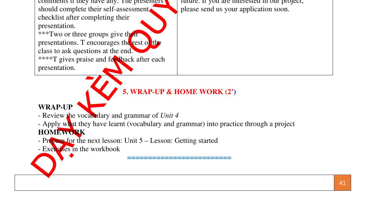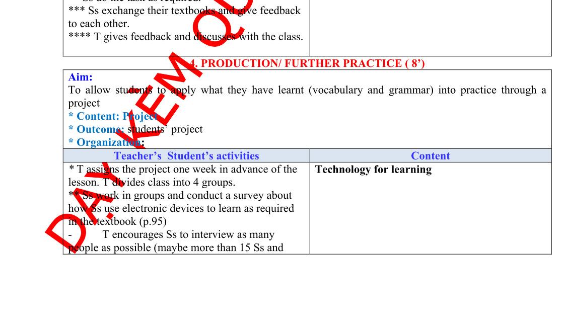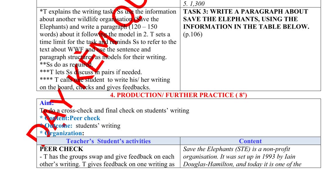 *** Ss practise their presentations in a time limit of 8 - 10 minutes while teacher walks round the class to monitor Ss’ preparation and makes sure that shy Ss also have the opportunity to contribute.