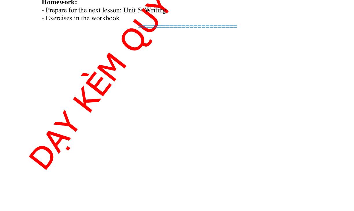 - Prepare for the next lesson: Unit 4: Speaking