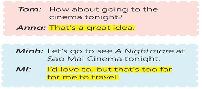 * Let’s + V-infinitive! It sounds good/ interesting/ great to me/… No, thanks./ Thanks but I can’t…